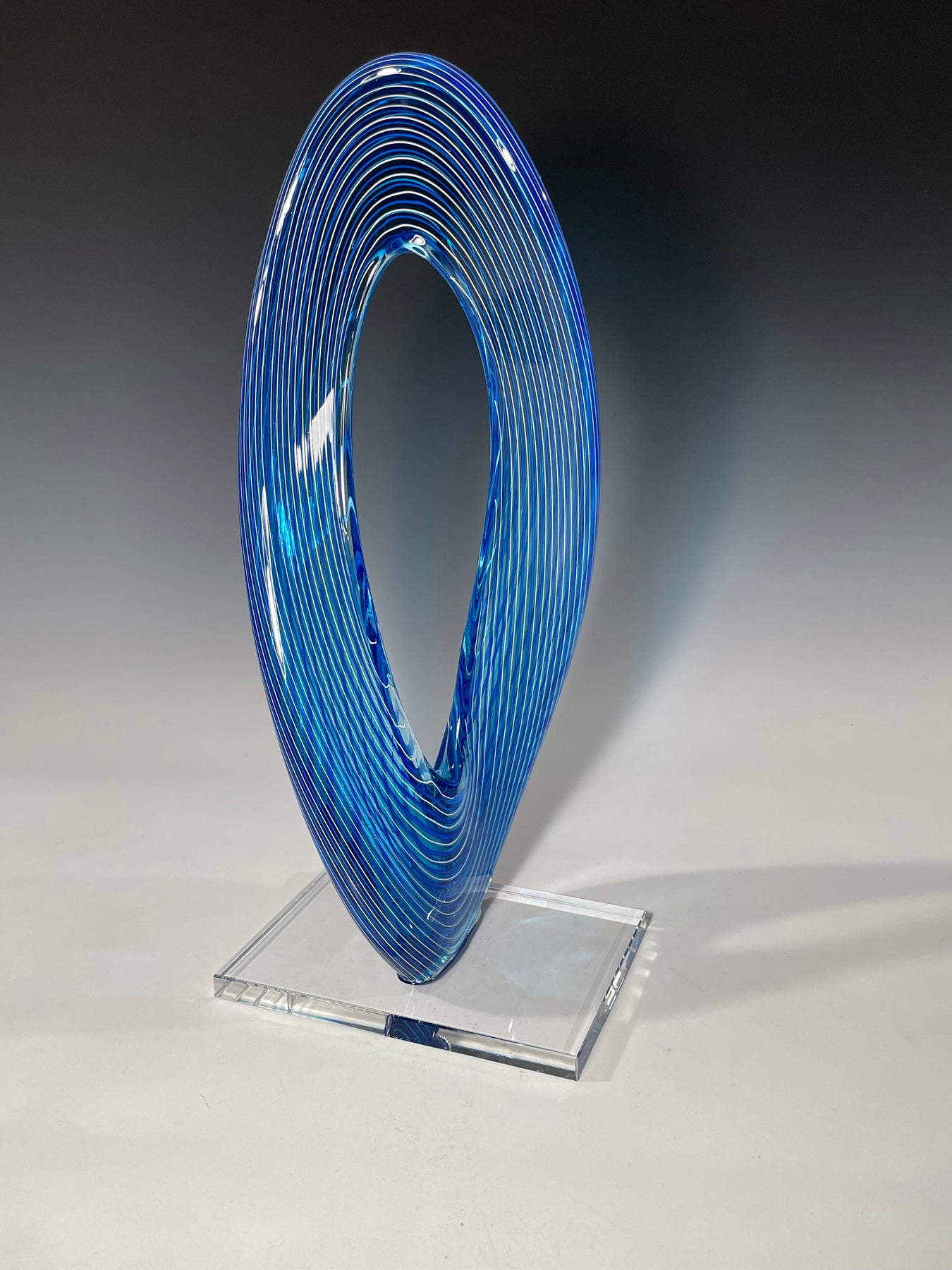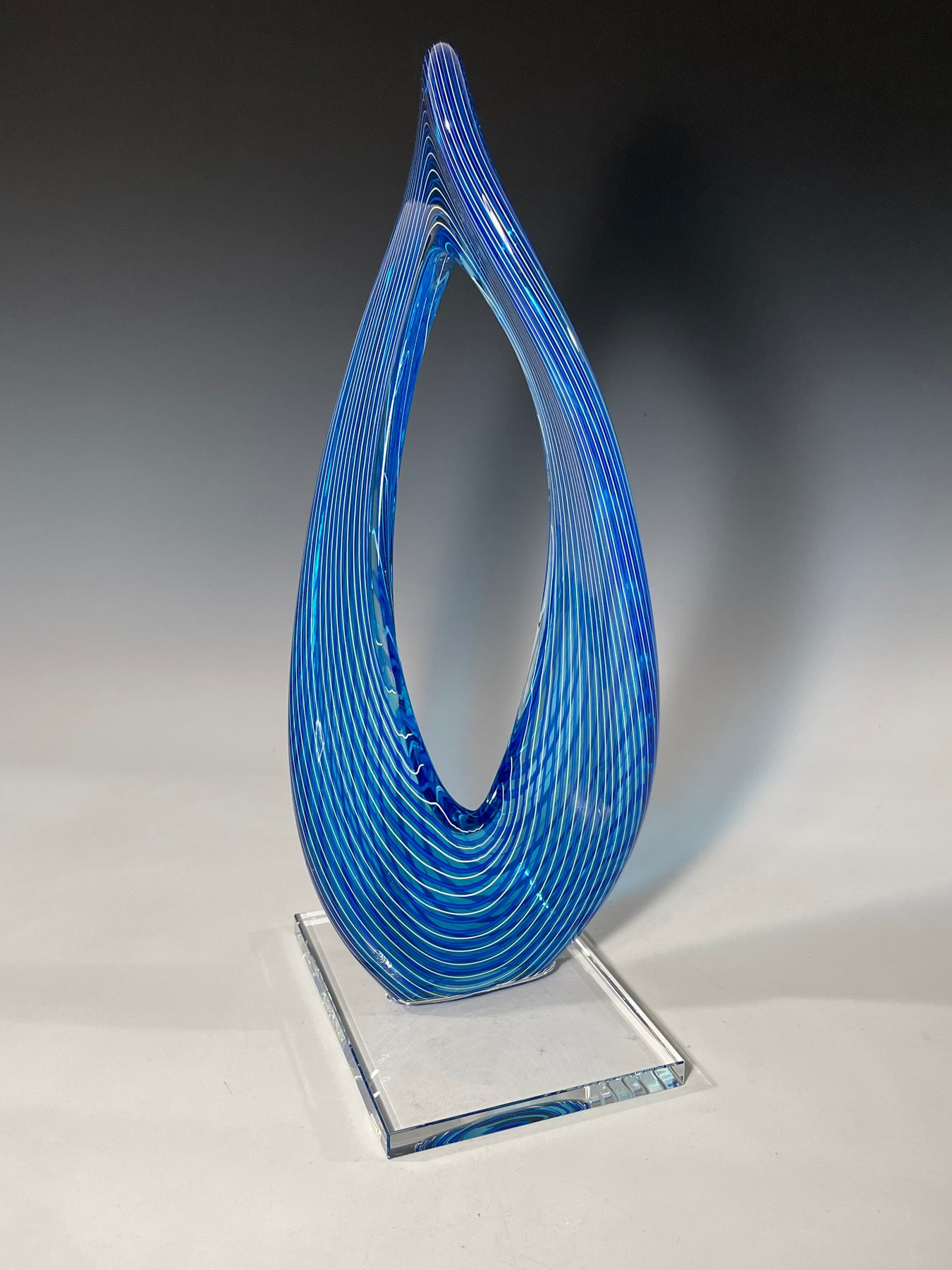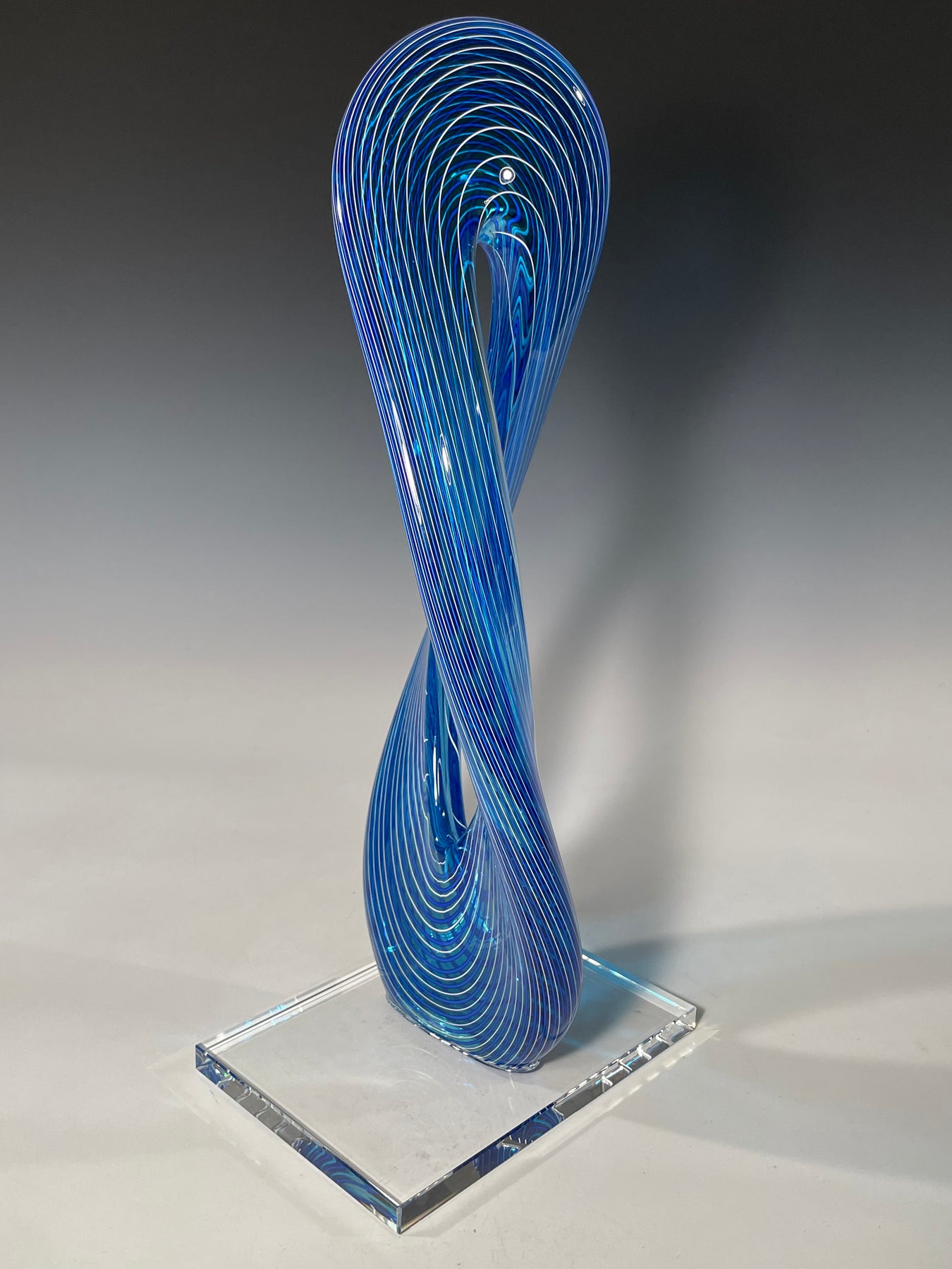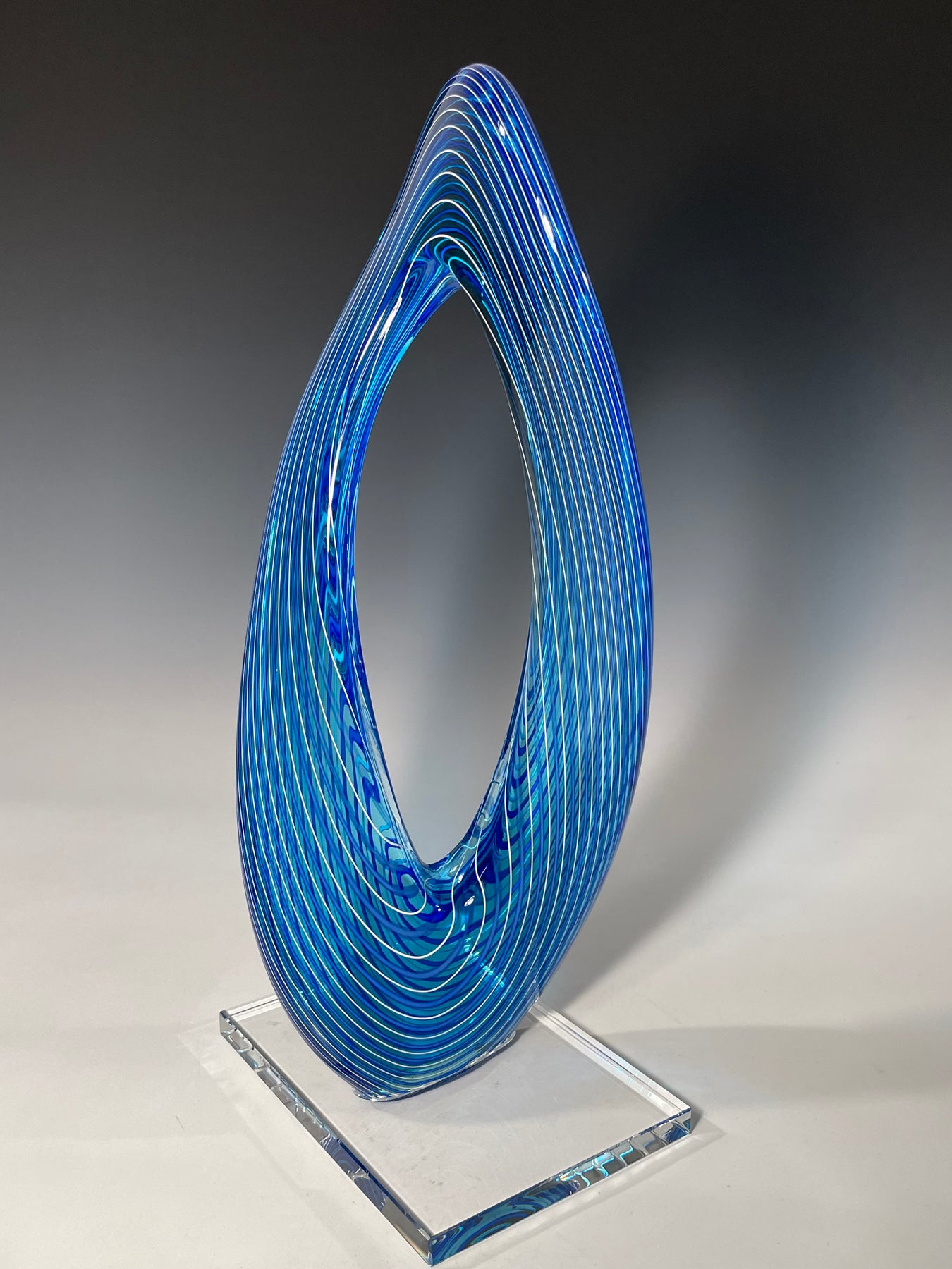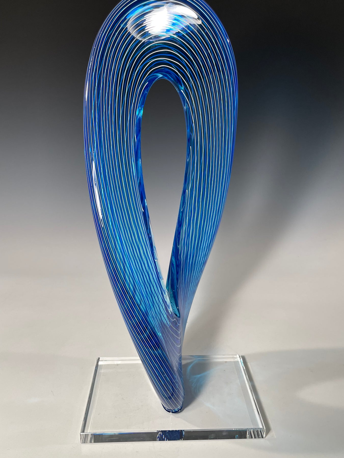 A one of a kind show stopper. This unique glass sculpture brings you through a portal of intrigue and mystery. Standing about 18 inches tall and 7.5 inches wide, this beautiful glass sculpture showcases classic glass blowing methods and techniques. With a sturdy base and a slight twist for dimension this one of a kind creation would be excellent as a gift , award or for a personal collection.