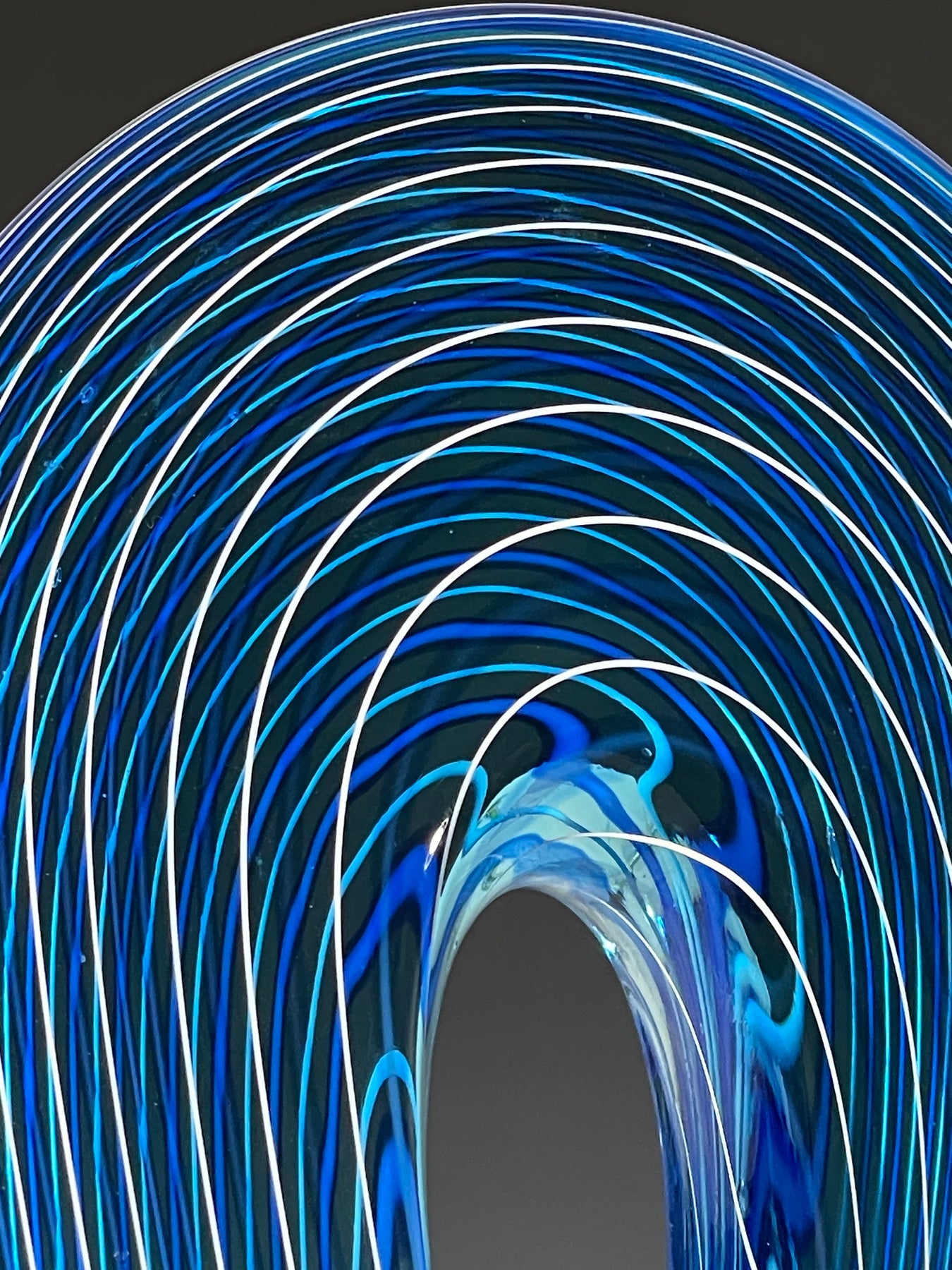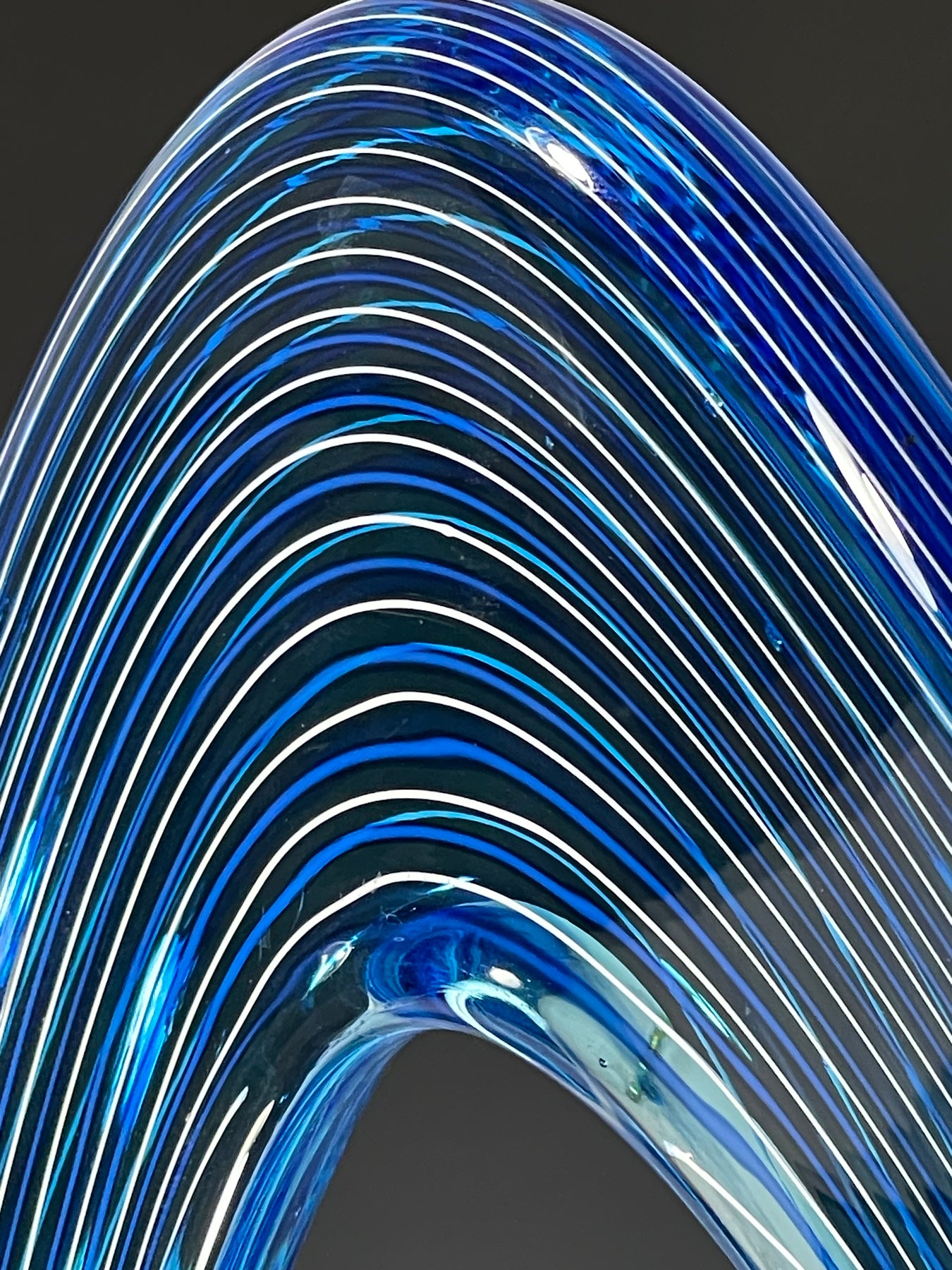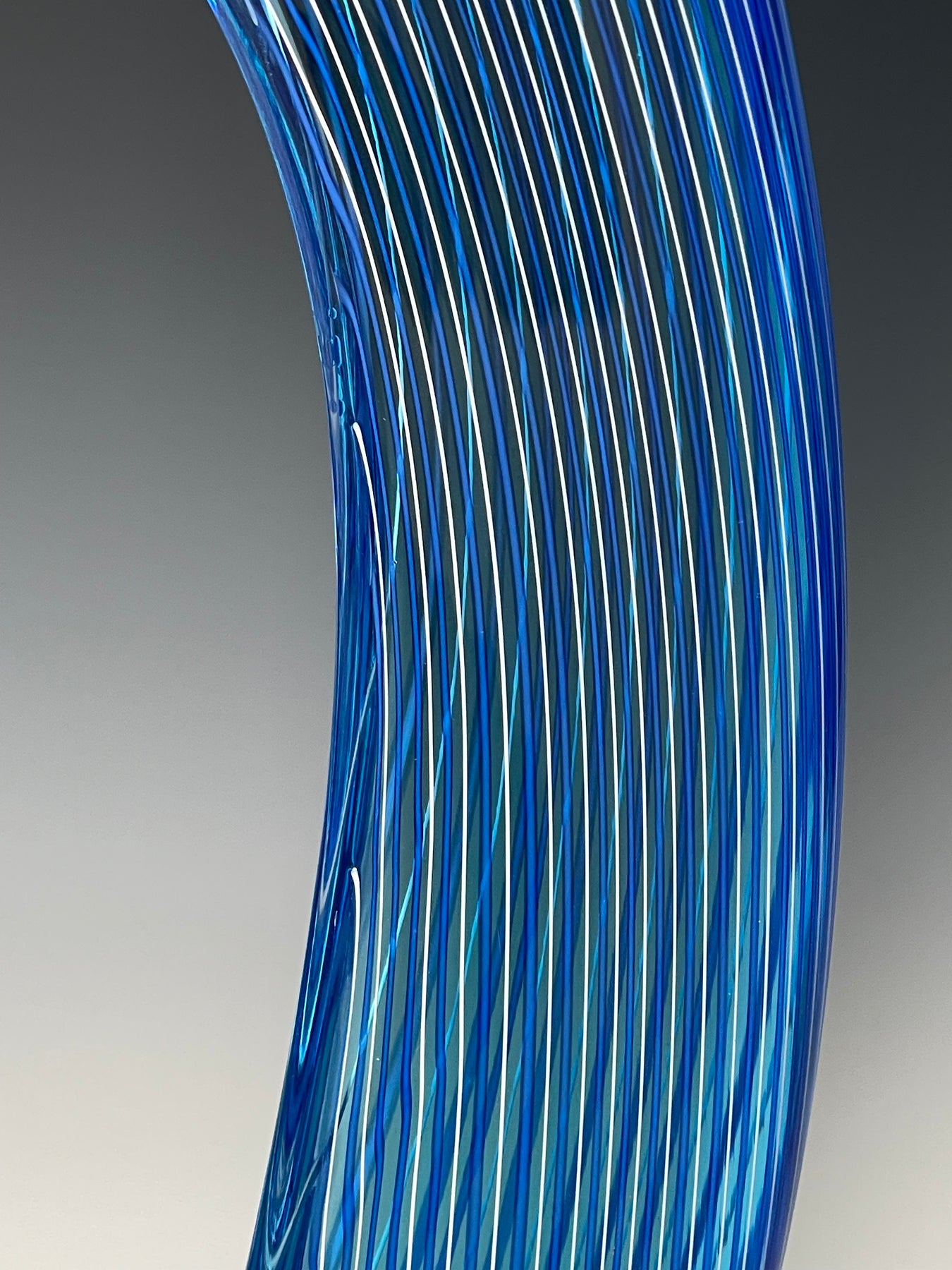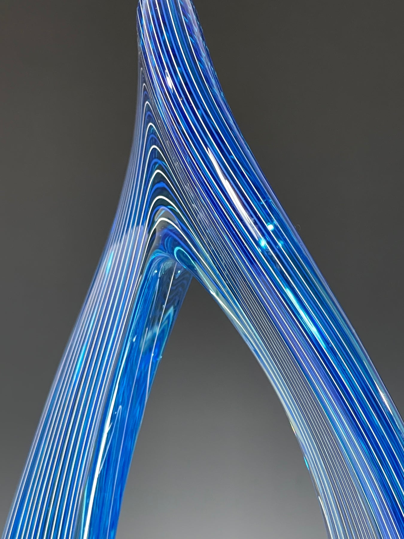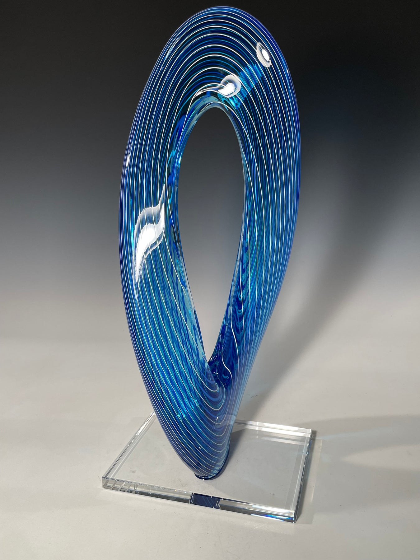 A one of a kind show stopper. This unique glass sculpture brings you through a portal of intrigue and mystery. Standing about 18 inches tall and 7.5 inches wide, this beautiful glass sculpture showcases classic glass blowing methods and techniques. With a sturdy base and a slight twist for dimension this one of a kind creation would be excellent as a gift , award or for a personal collection.