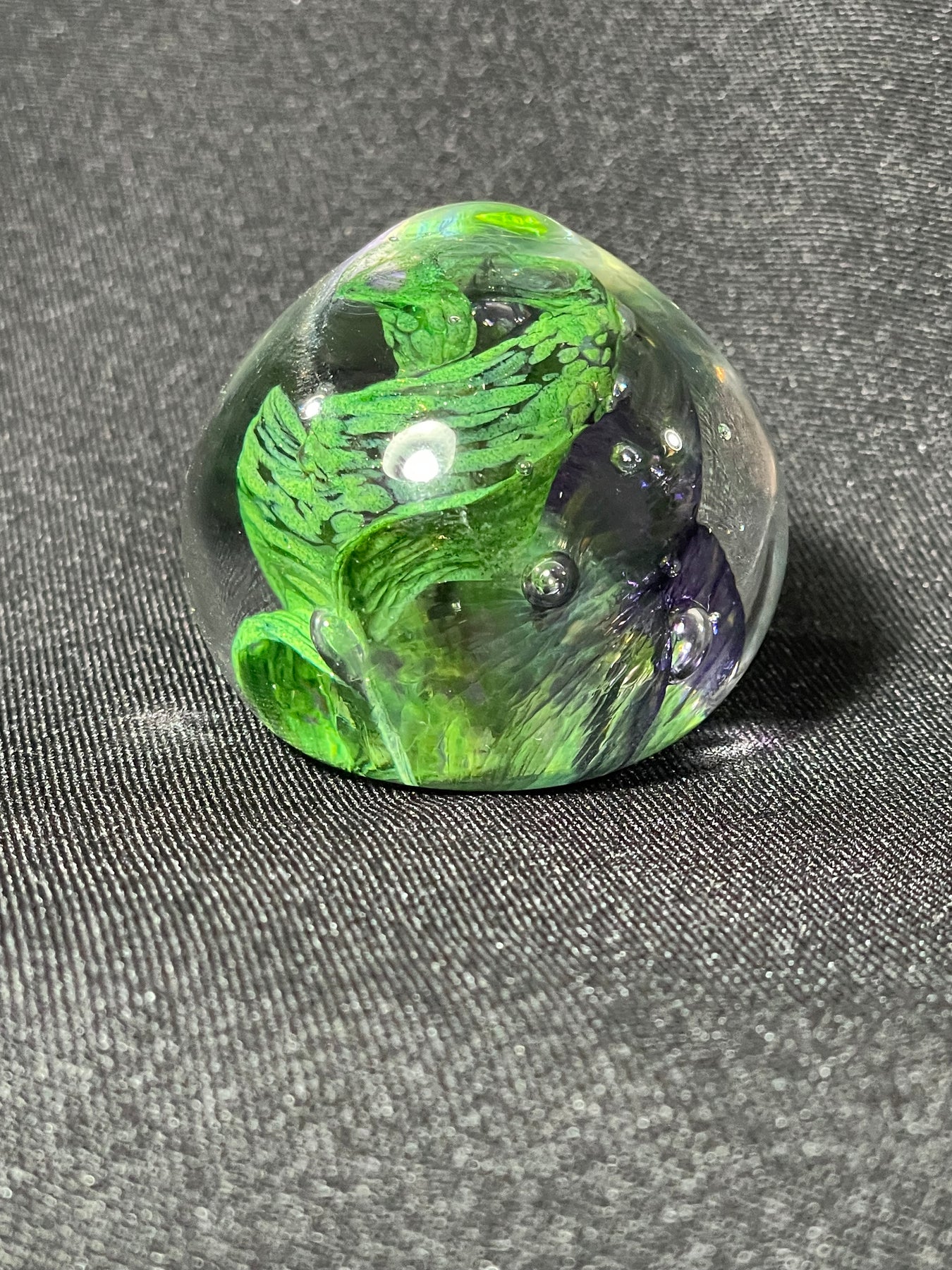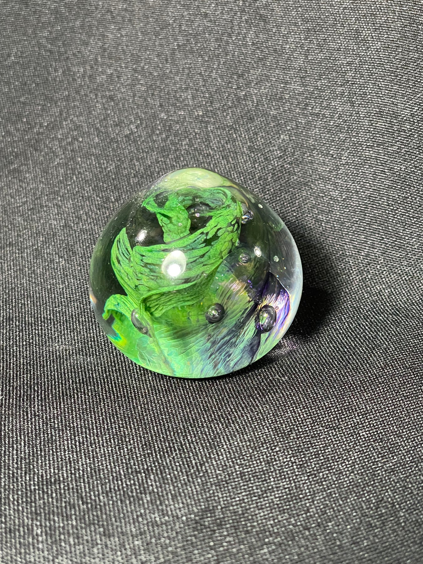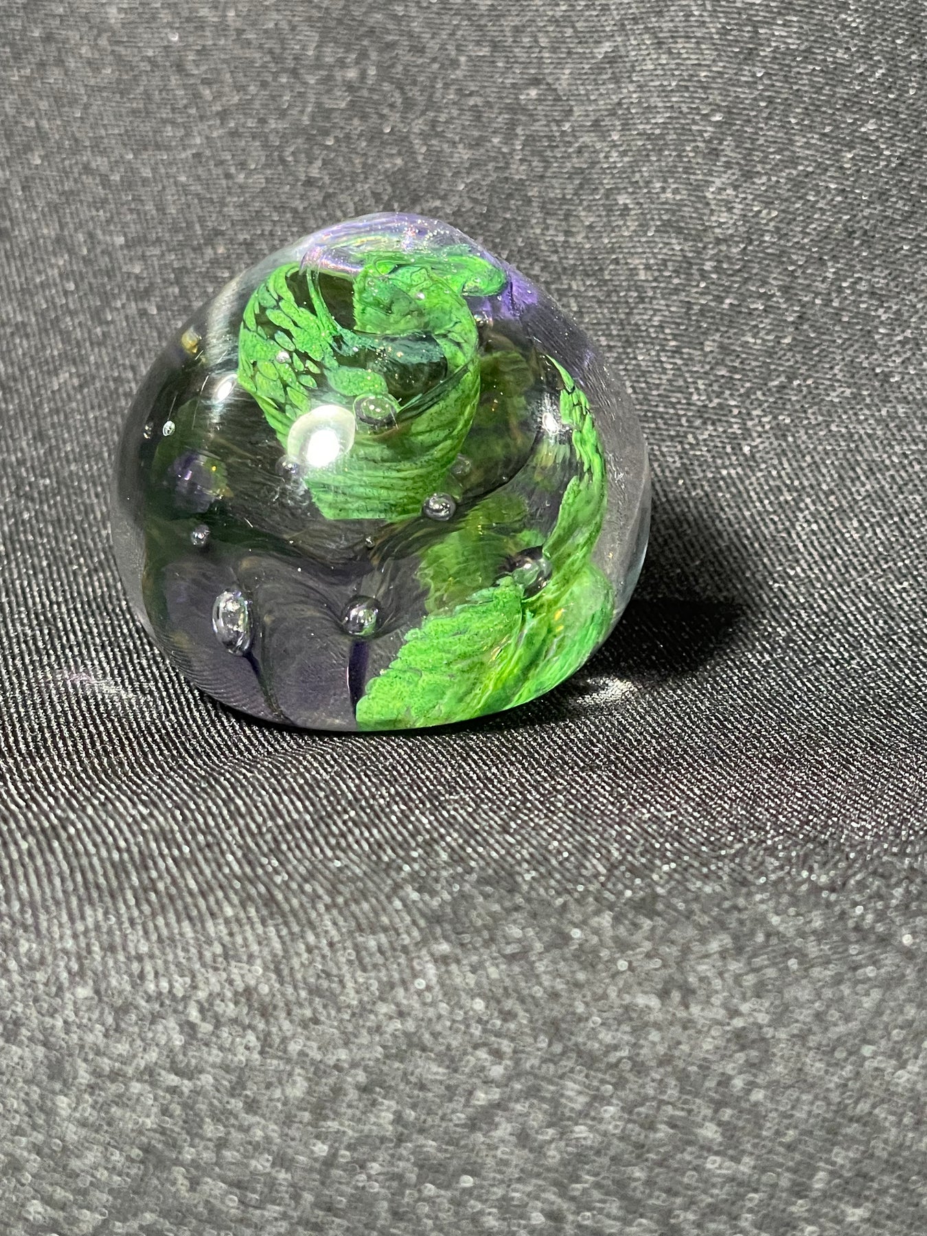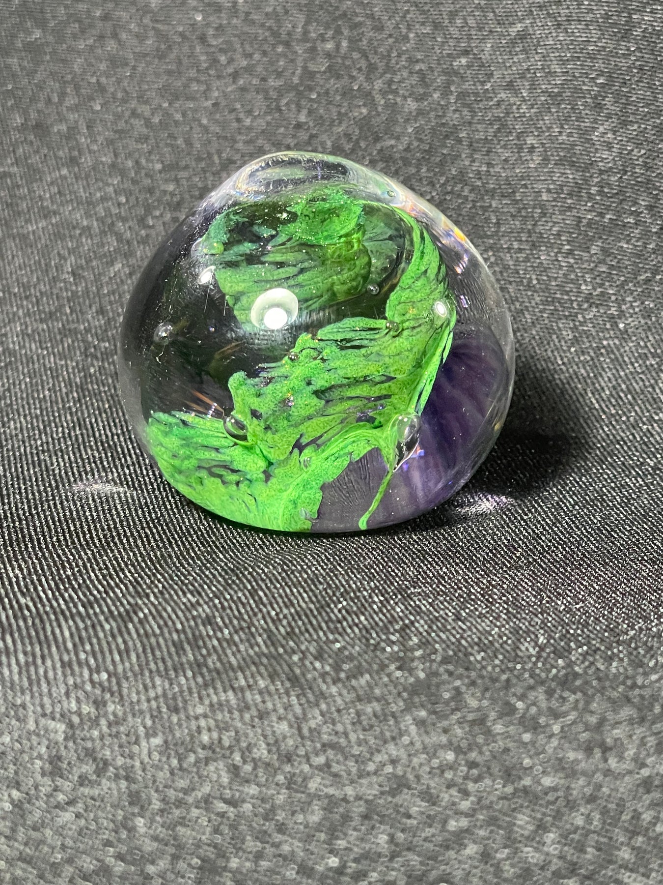 This marble starts off with a ball of molten clear glass and is then rolled into smaller pieces of colored glass. It is then put into a mold and shaped into a perfect sphere. This beauty sits flat and stays exactly where you leave it. Measuring about 2 inches.