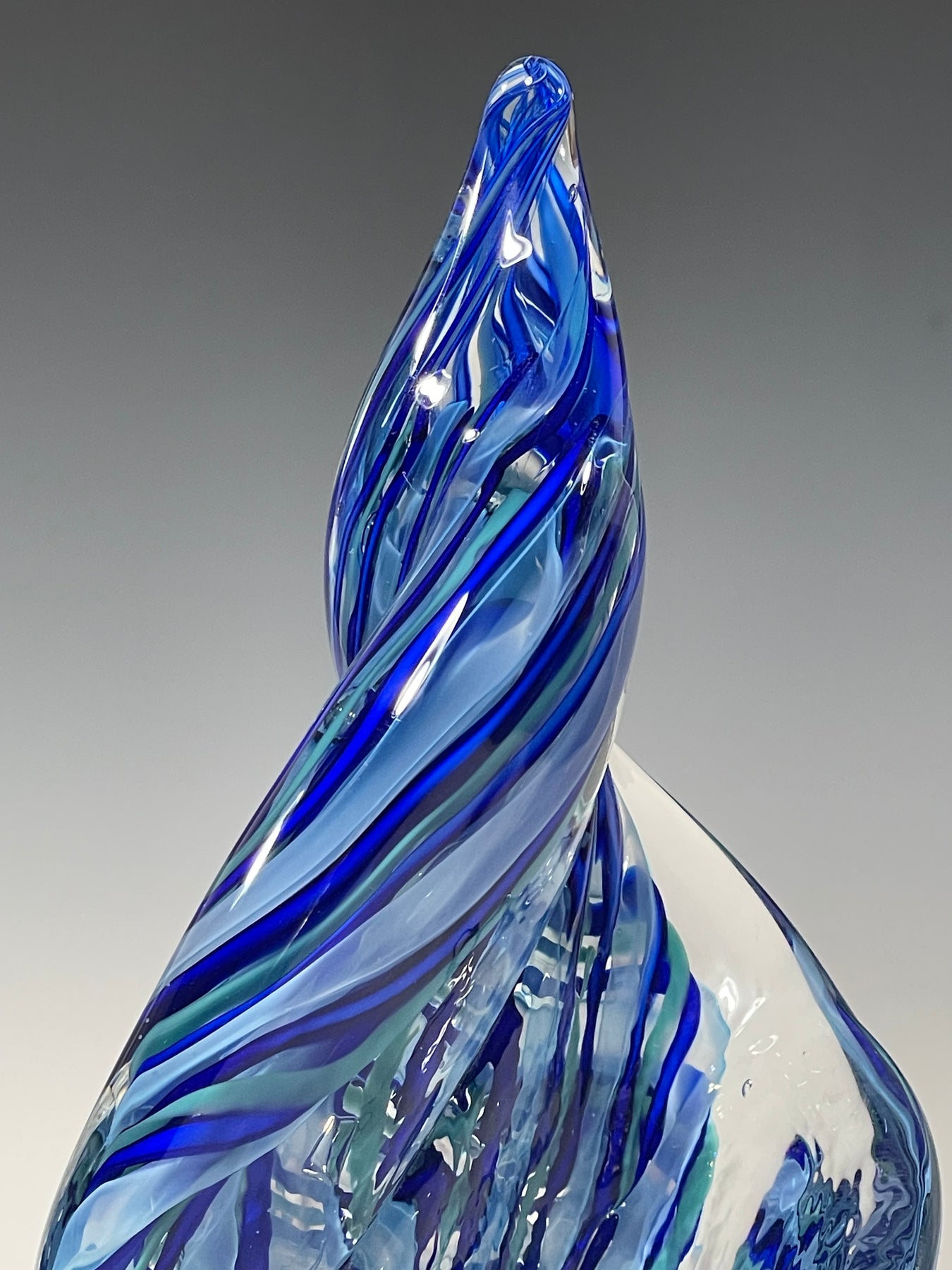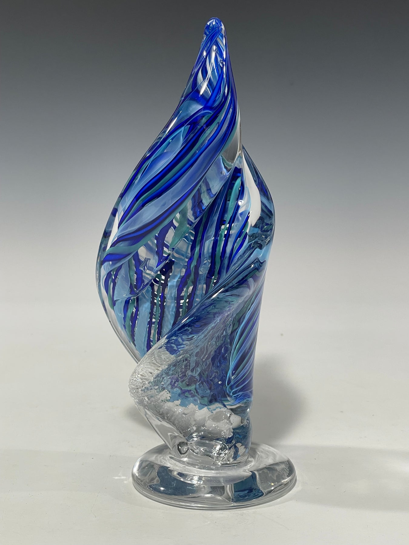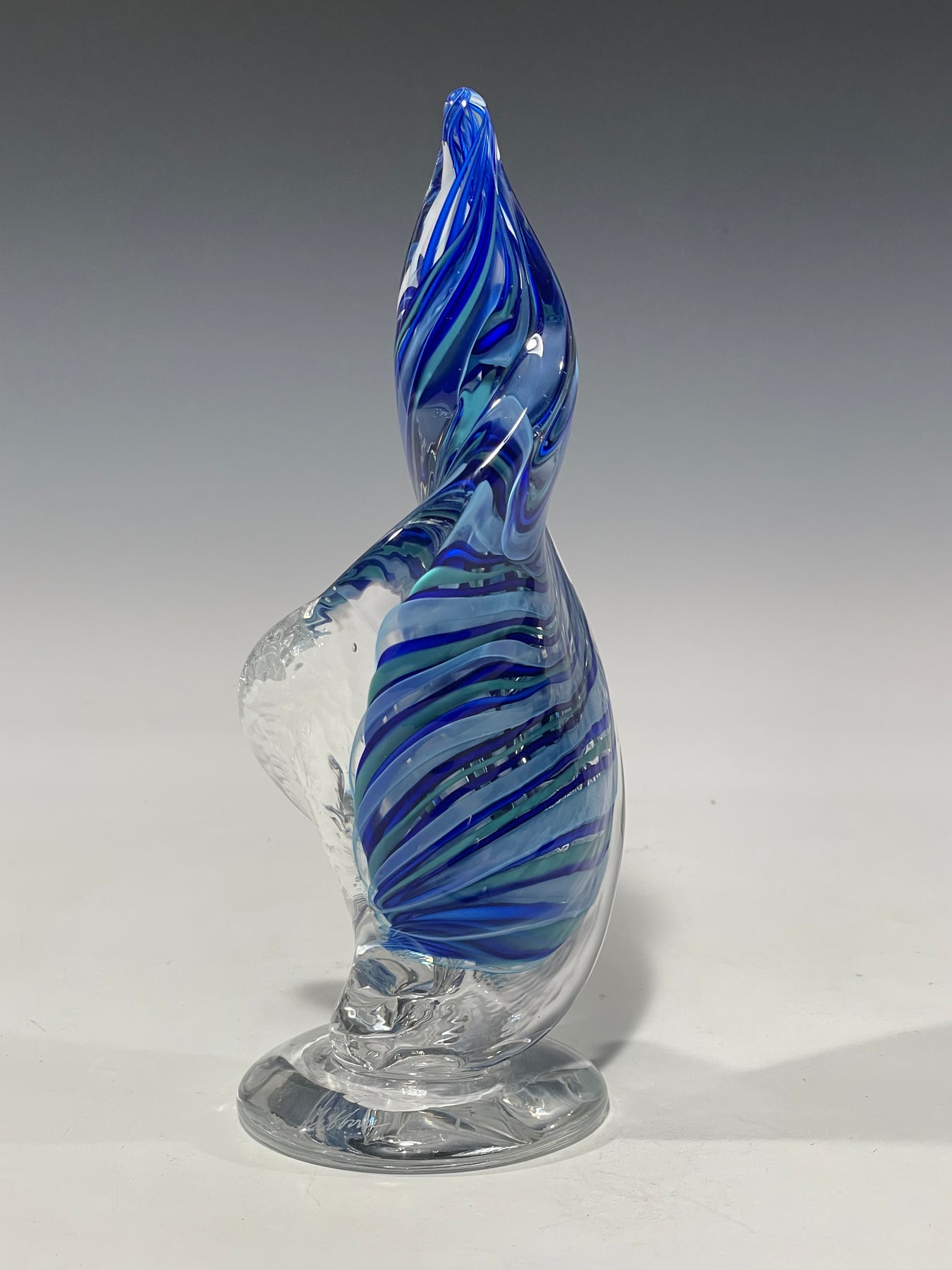A one of a kind show stopper. This unique glass sculpture brings you through a portal of intrigue and mystery. Standing about 8 inches tall and 4 inches wide, this beautiful glass sculpture showcases classic glass blowing methods and techniques. With a sturdy base and a slight twist for dimension this one of a kind creation would be excellent as a gift , award or for a personal collection.