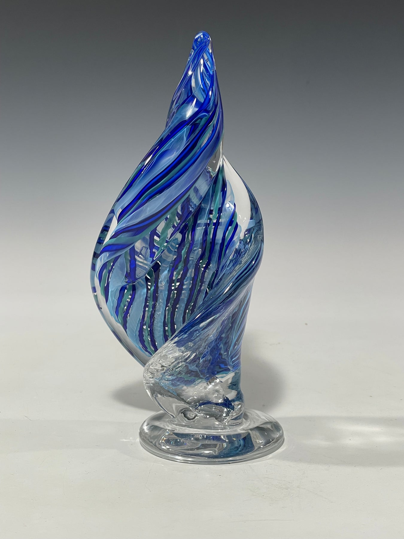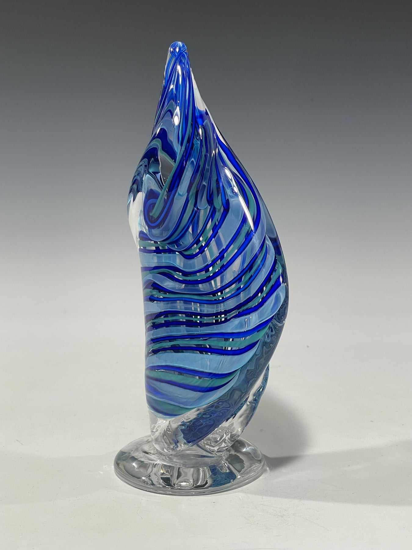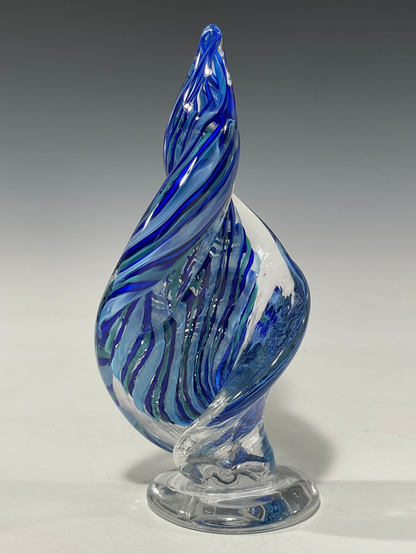 A one of a kind show stopper. This unique glass sculpture brings you through a portal of intrigue and mystery. Standing about 8 inches tall and 4 inches wide, this beautiful glass sculpture showcases classic glass blowing methods and techniques. With a sturdy base and a slight twist for dimension this one of a kind creation would be excellent as a gift , award or for a personal collection.