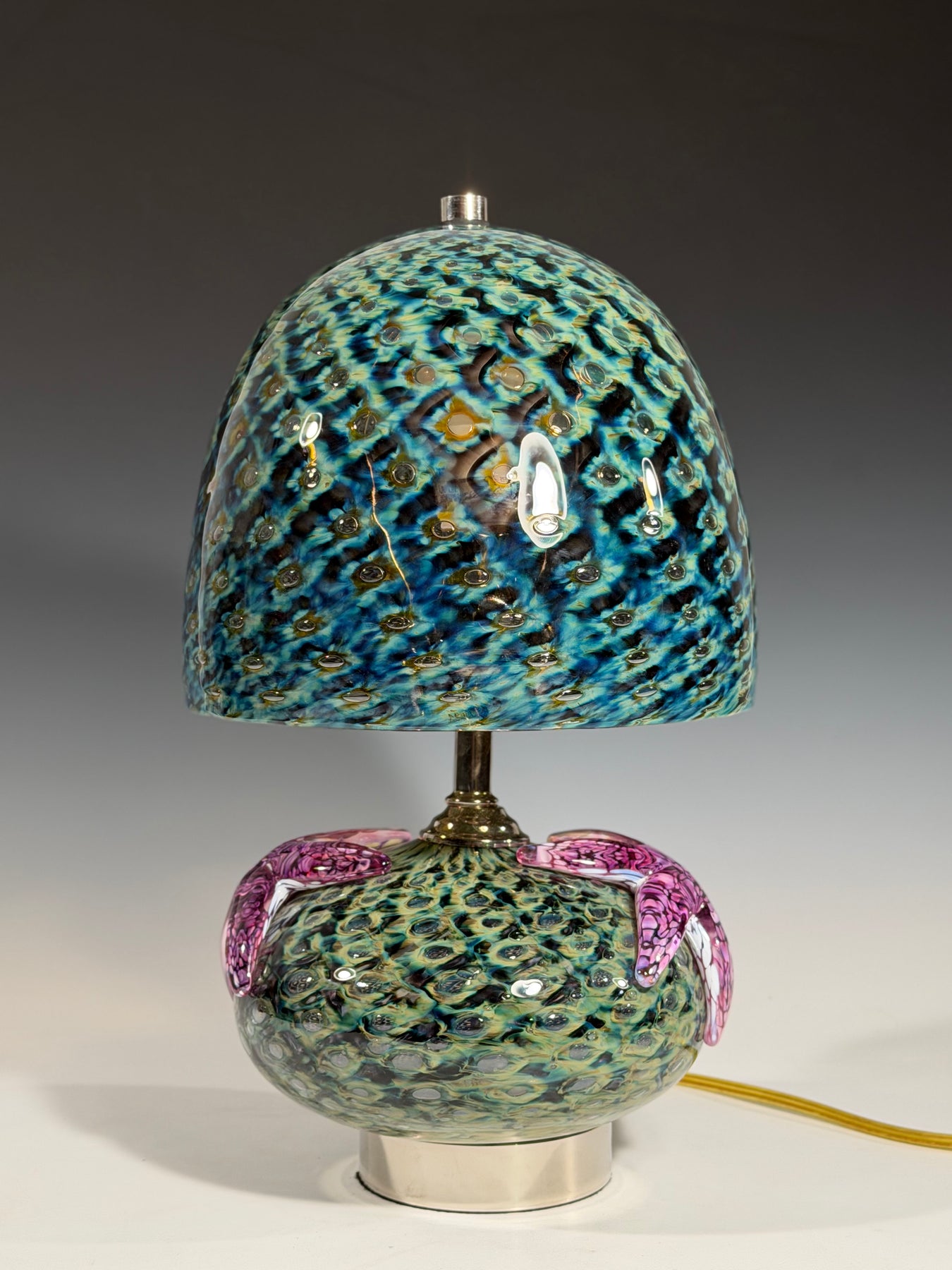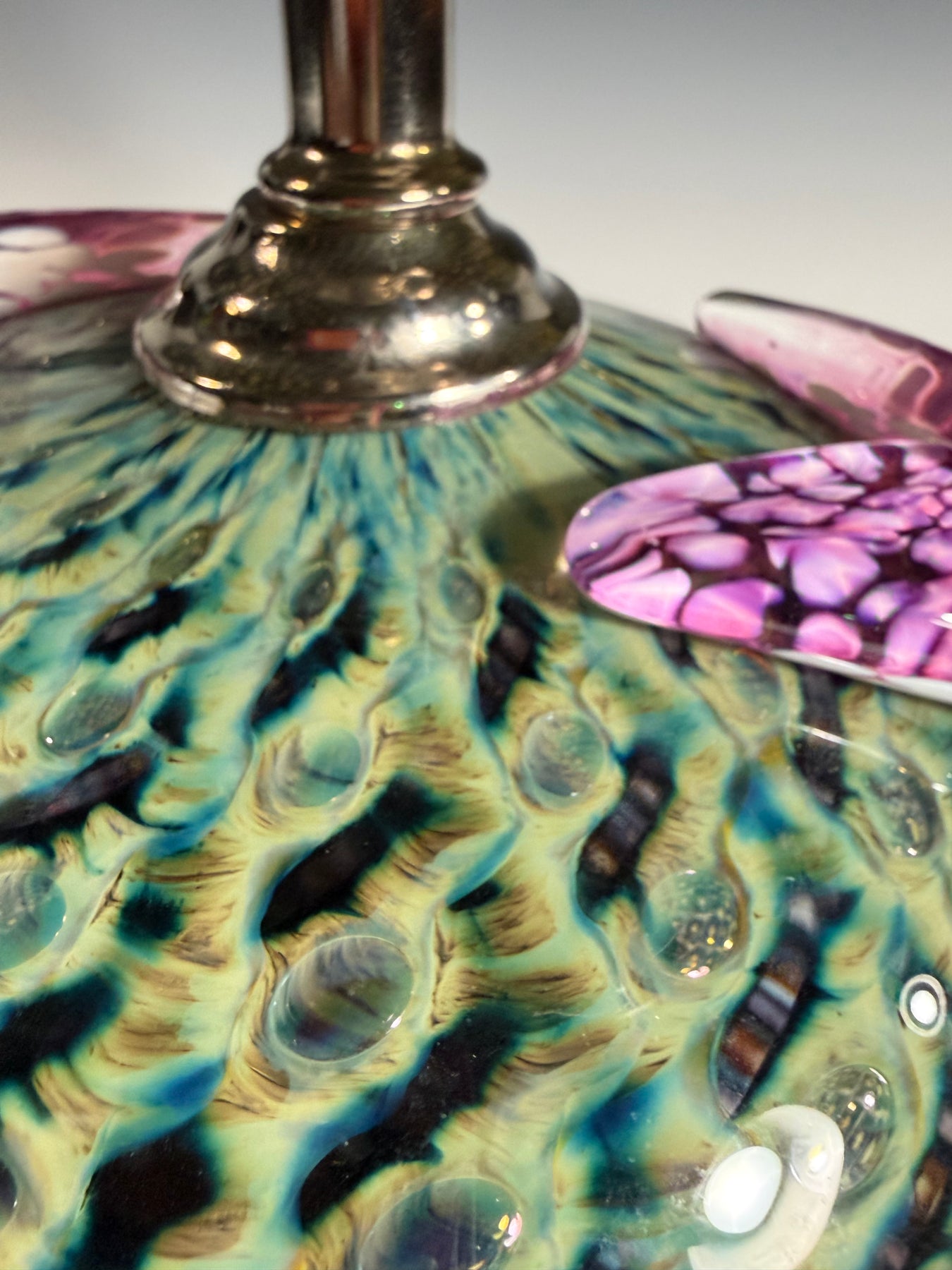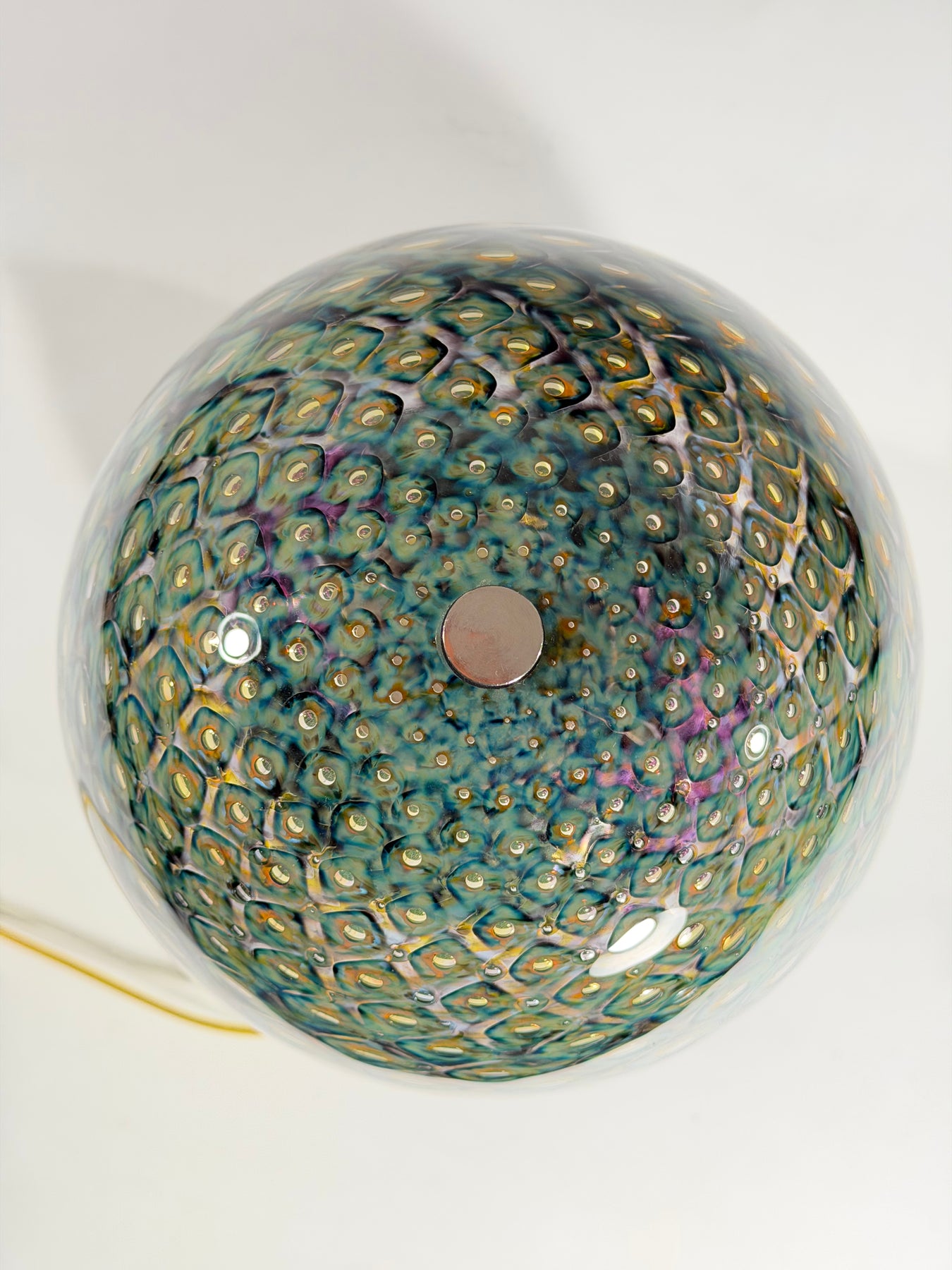 These hand-blown glass light pendants were created by rolling the clear molten glass through several colors of powdered glass. It is then blown into a bronze mold called a pineapple mold to give it the pattern of bubbles trapped in the glass. After it comes out of the mold another layer of molten clear glass is put on top of the bubble, and it is blown and shaped by hand with wet newspaper to become a perfectly shaped shade.