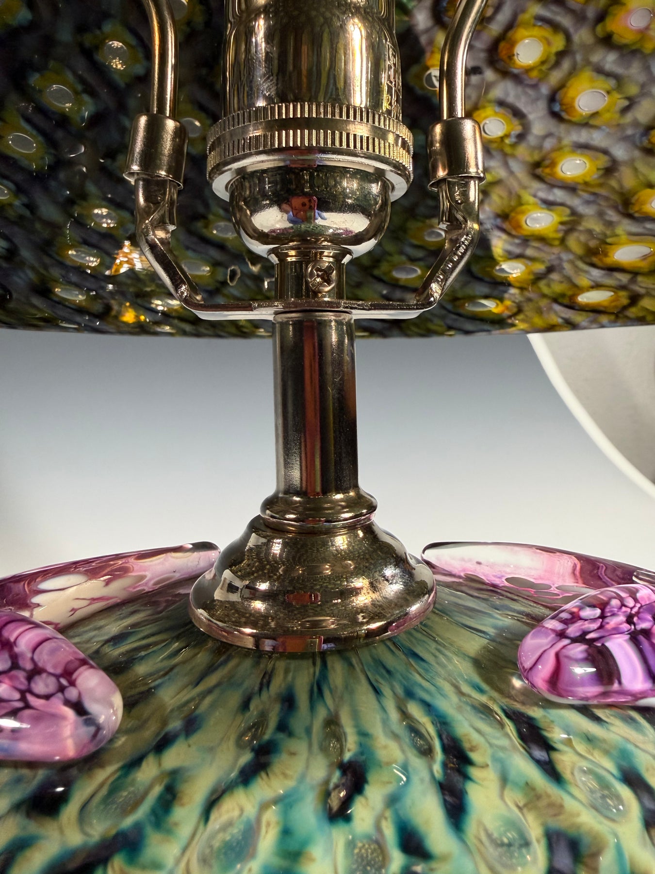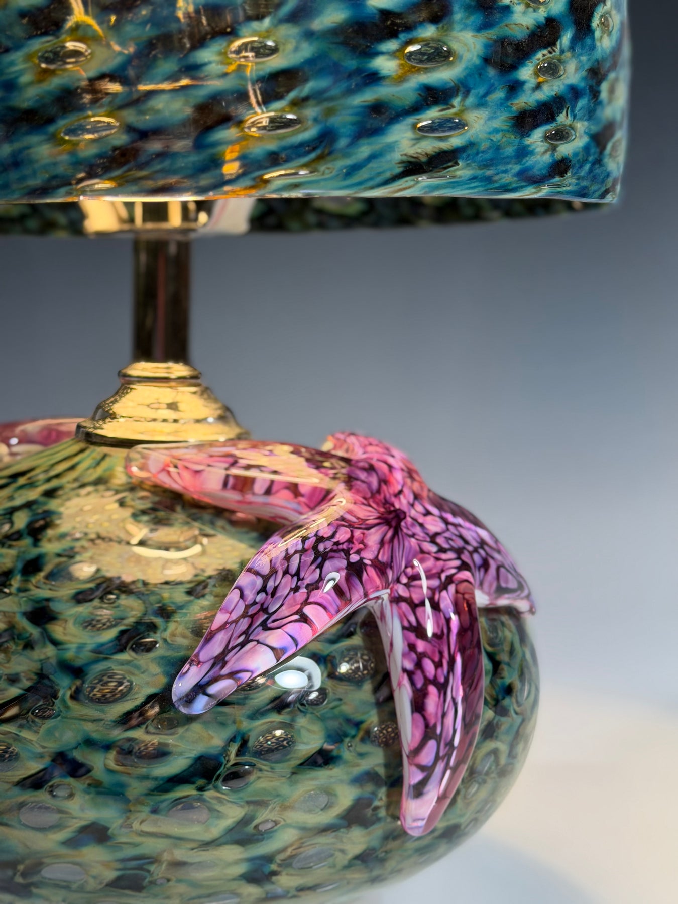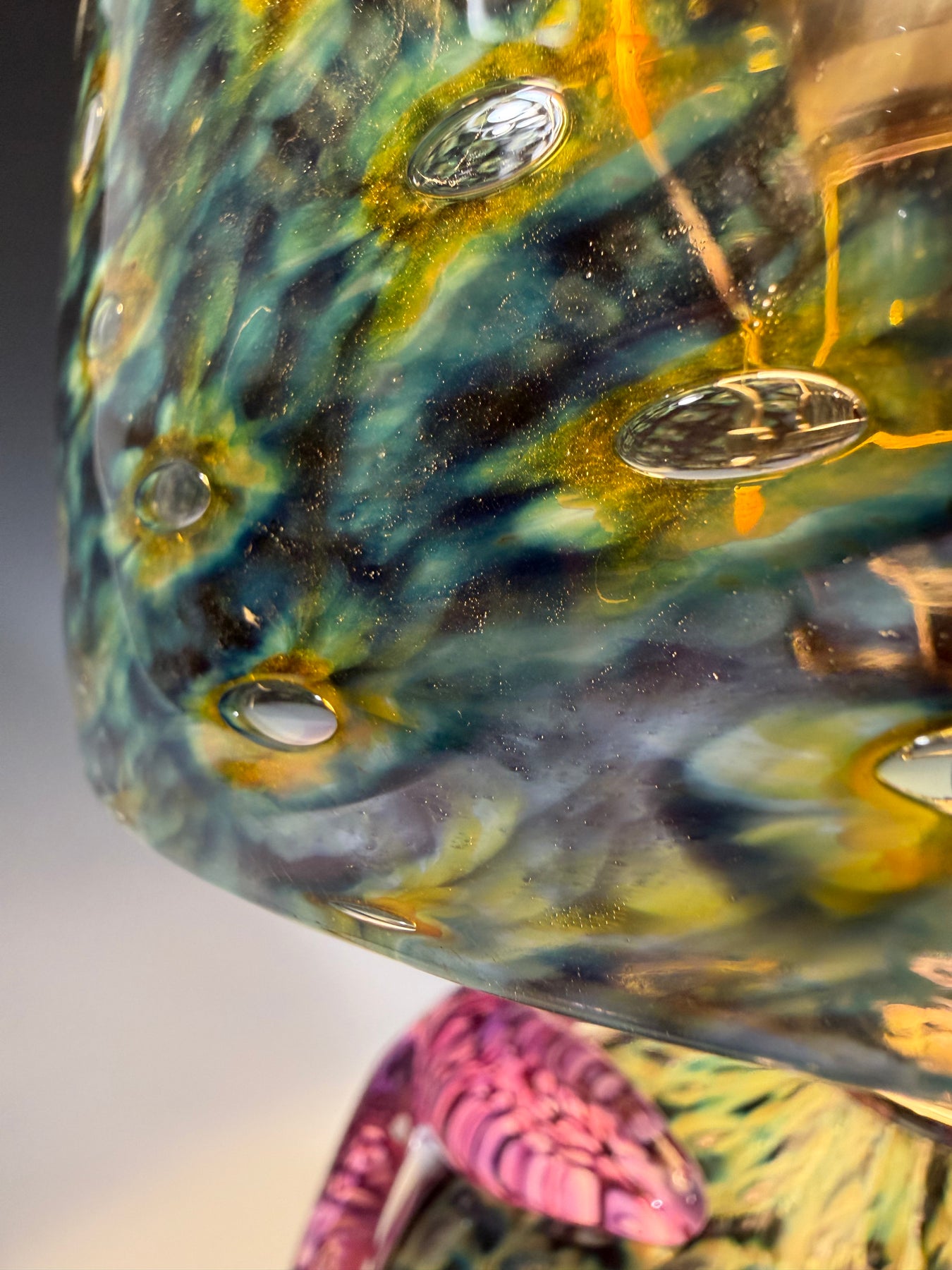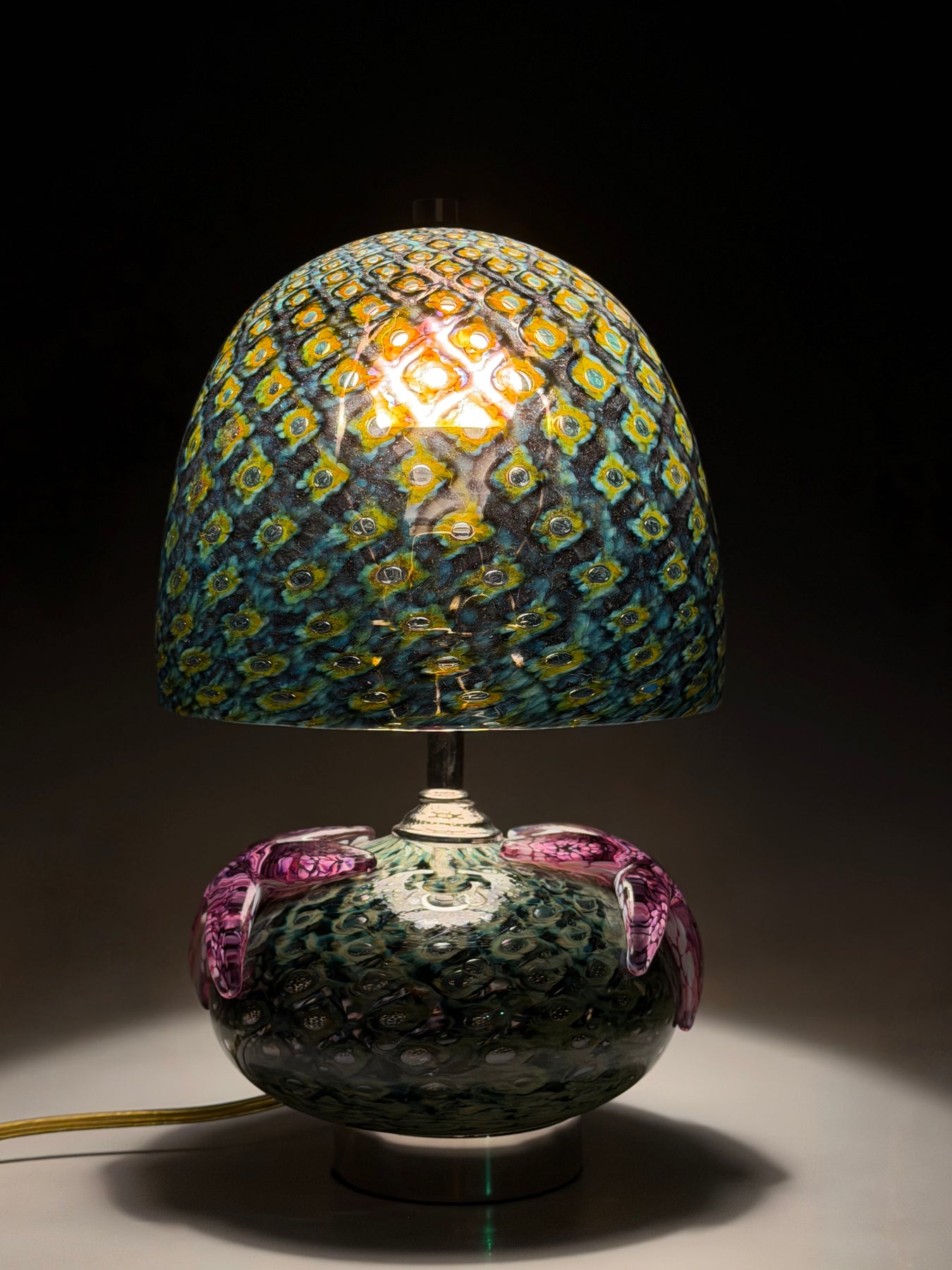 These hand-blown glass light pendants were created by rolling the clear molten glass through several colors of powdered glass. It is then blown into a bronze mold called a pineapple mold to give it the pattern of bubbles trapped in the glass. After it comes out of the mold another layer of molten clear glass is put on top of the bubble, and it is blown and shaped by hand with wet newspaper to become a perfectly shaped shade.