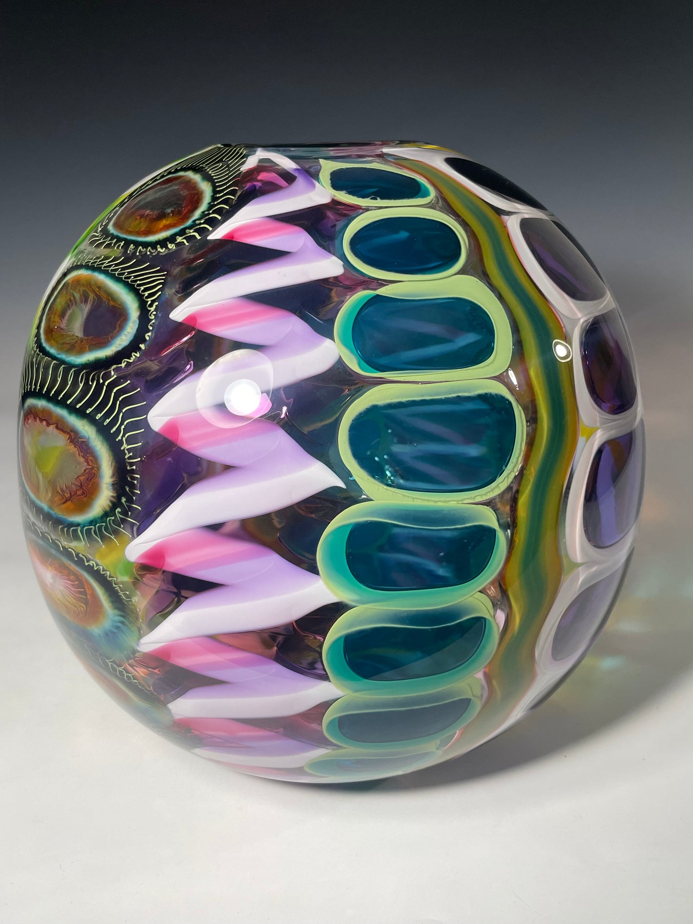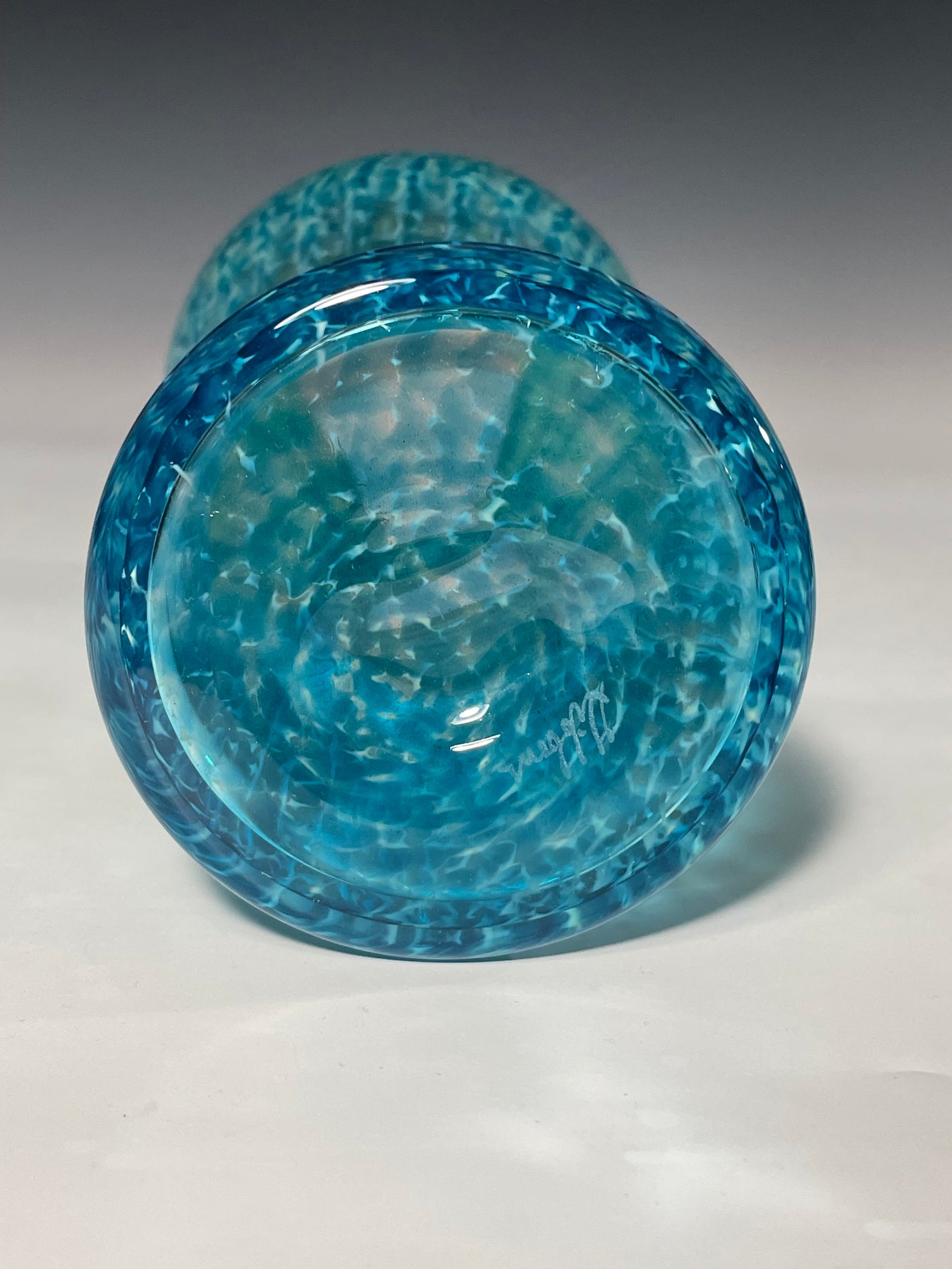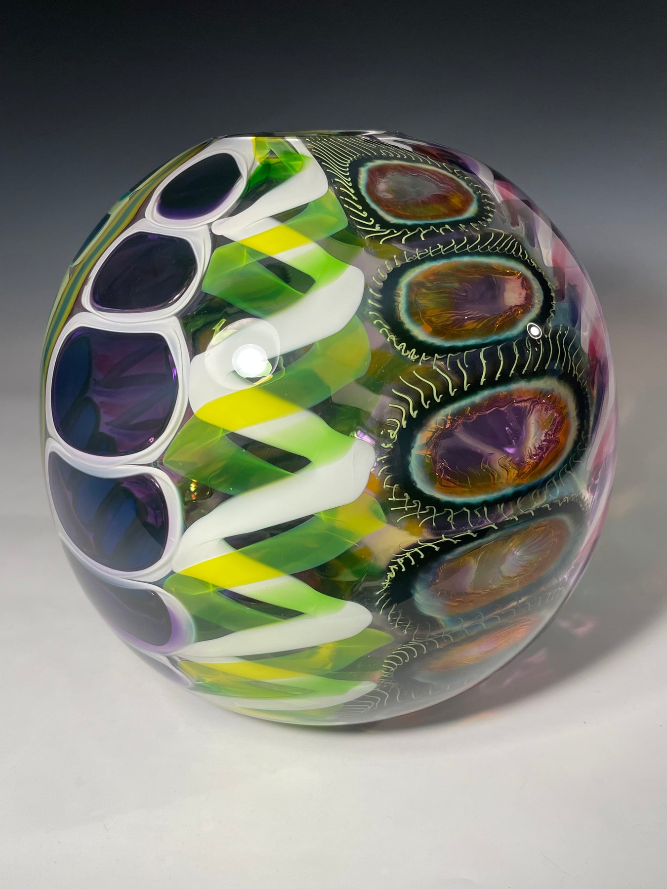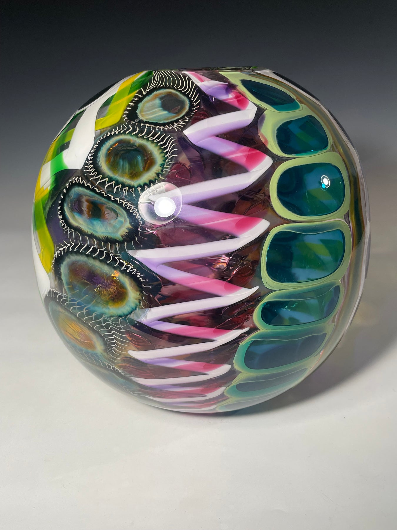 Este par de pulpos en duelo está luchando por abrir una burbuja de vidrio soplado de color azul agua con patas. John calentó la abertura superior del recipiente para que pareciera que las patas del pulpo lo estaban separando. El color de esta pareja de pulpos es magenta moteado.