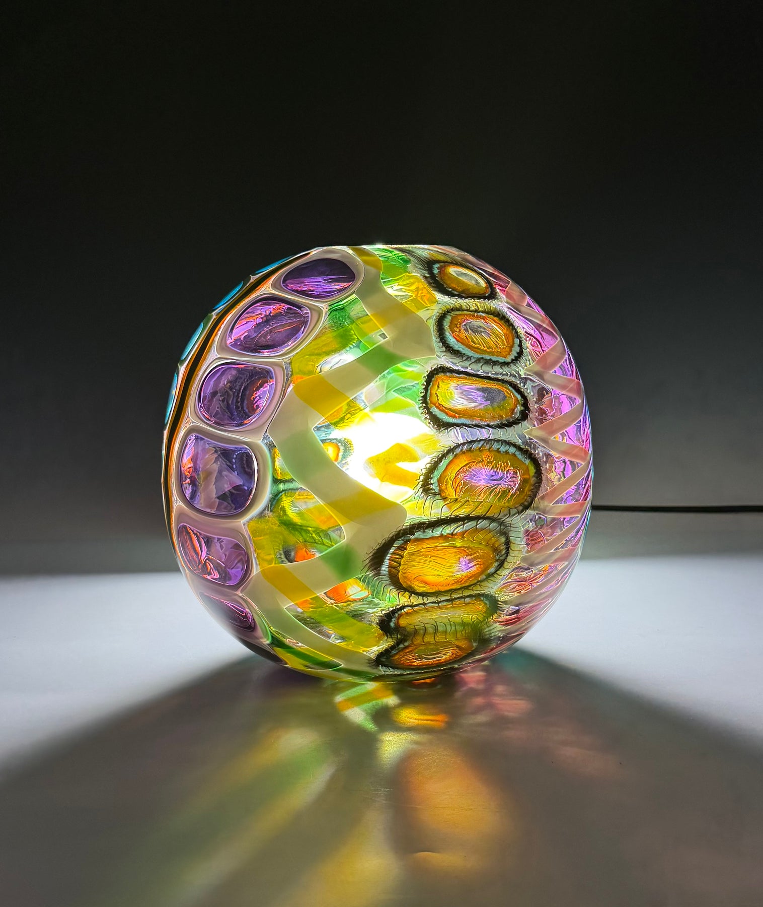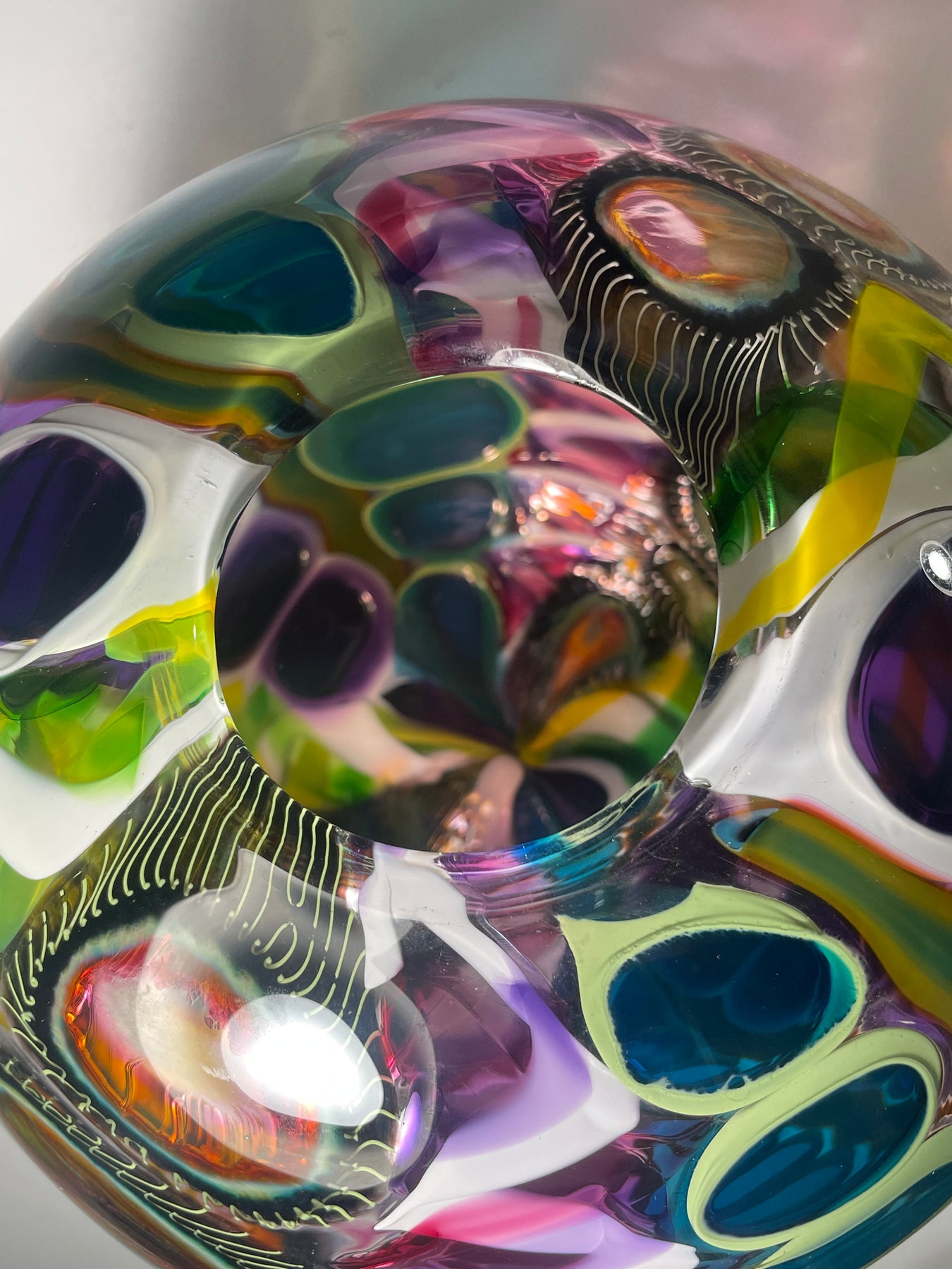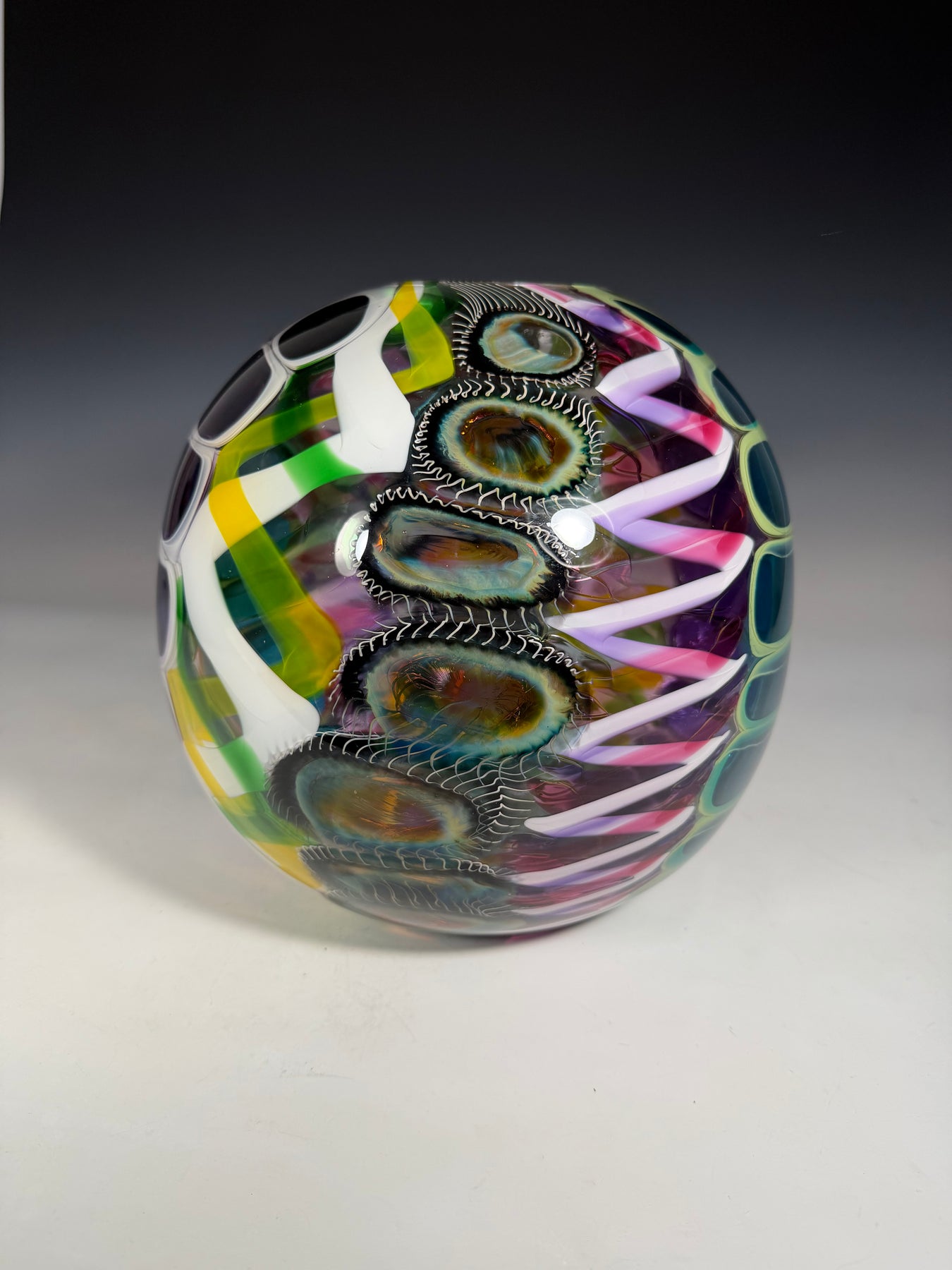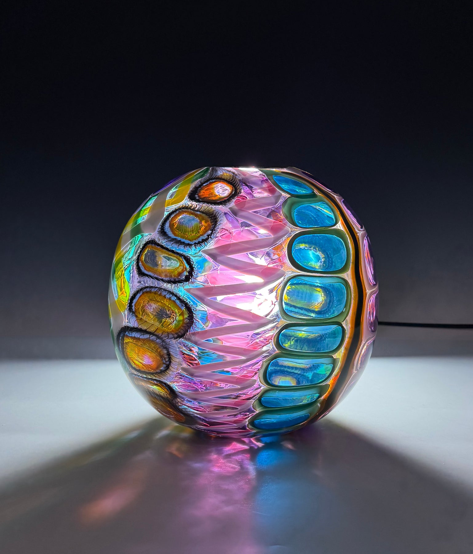 Este par de pulpos en duelo está luchando por abrir una burbuja de vidrio soplado de color azul agua con patas. John calentó la abertura superior del recipiente para que pareciera que las patas del pulpo lo estaban separando. El color de esta pareja de pulpos es magenta moteado.