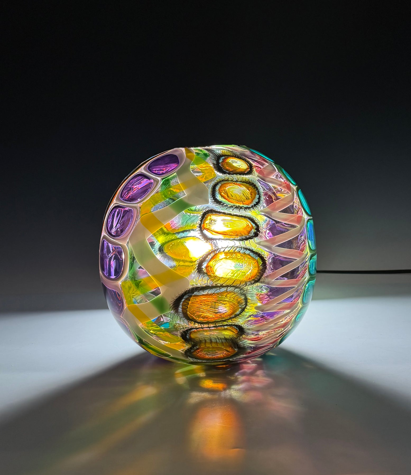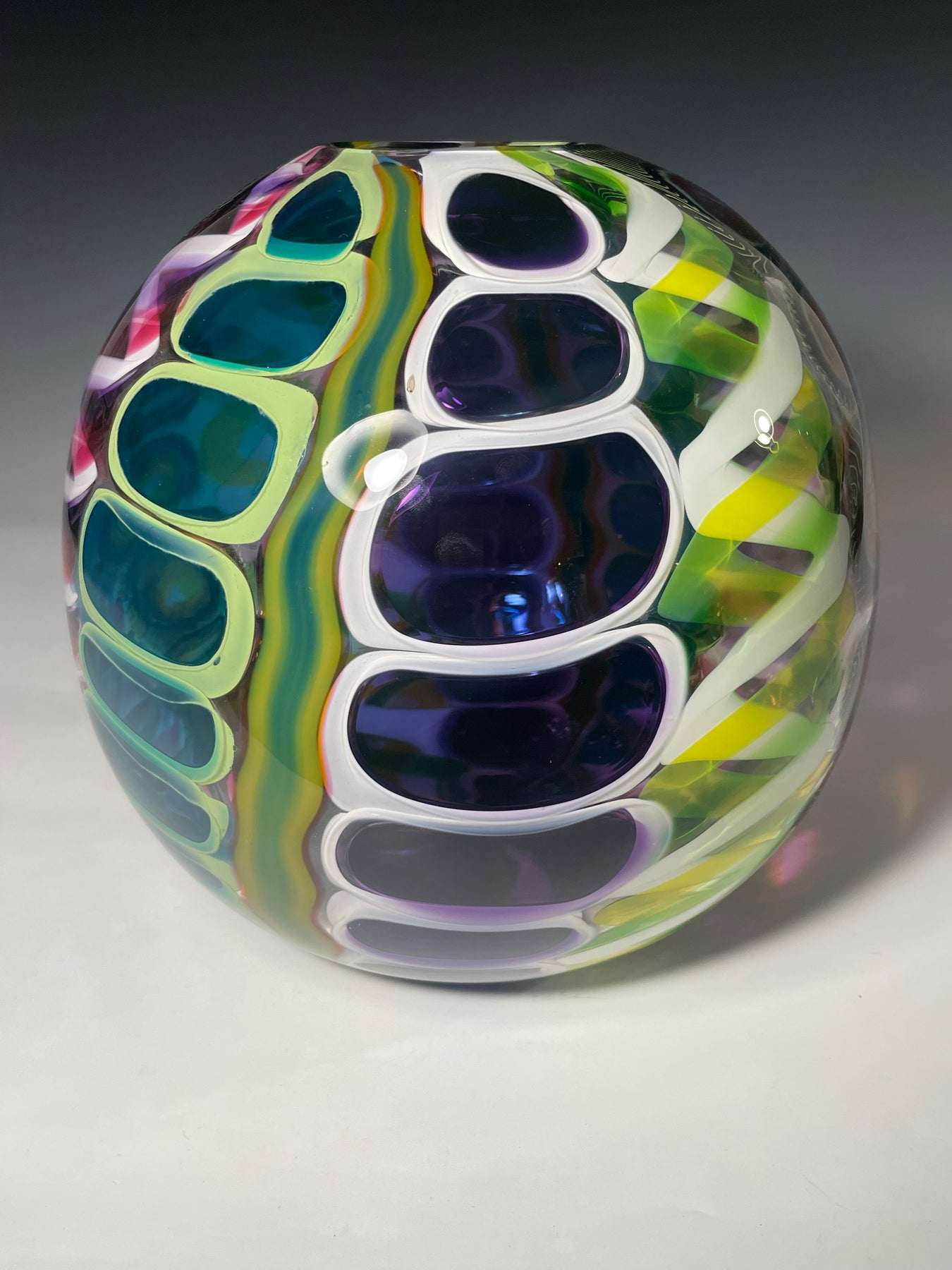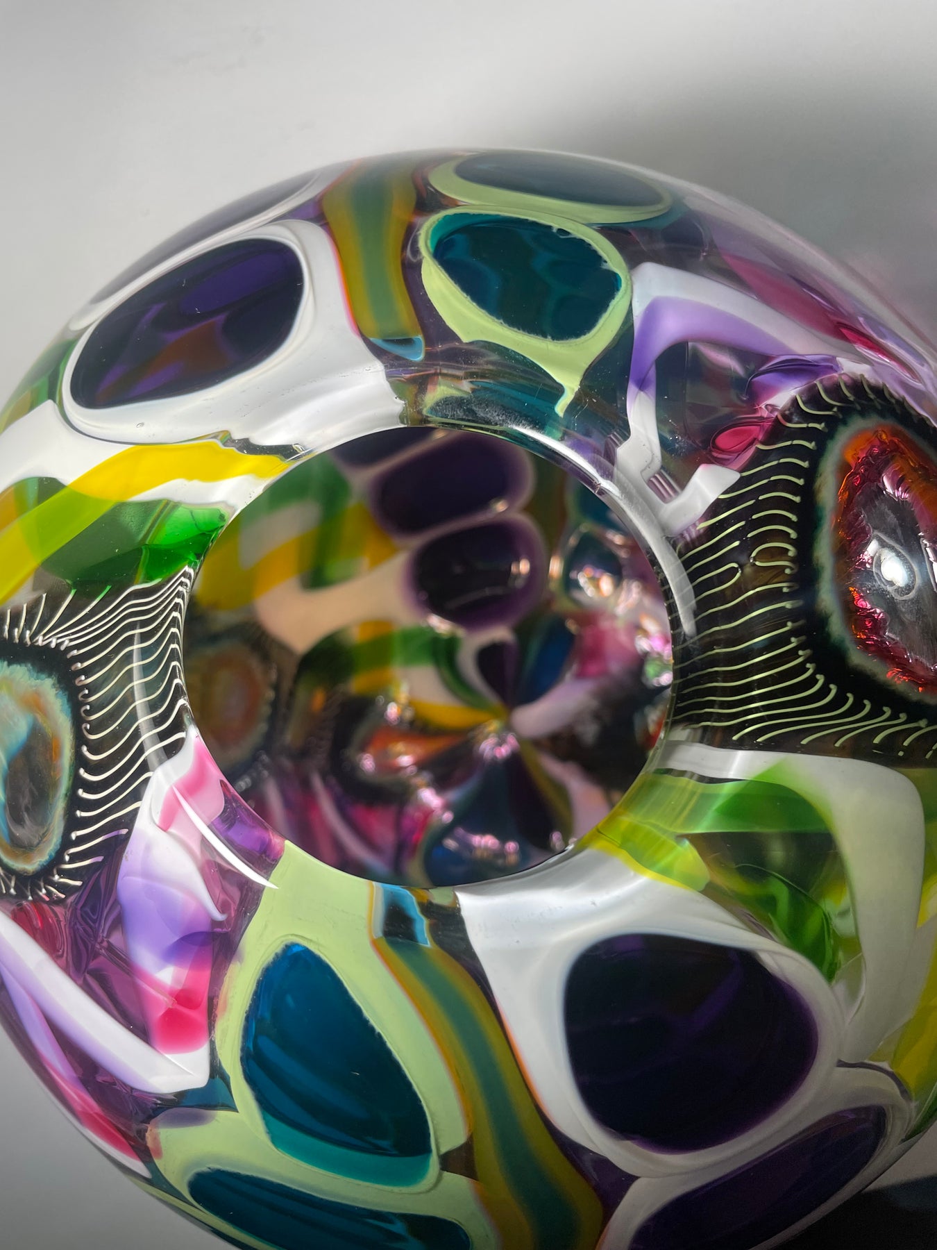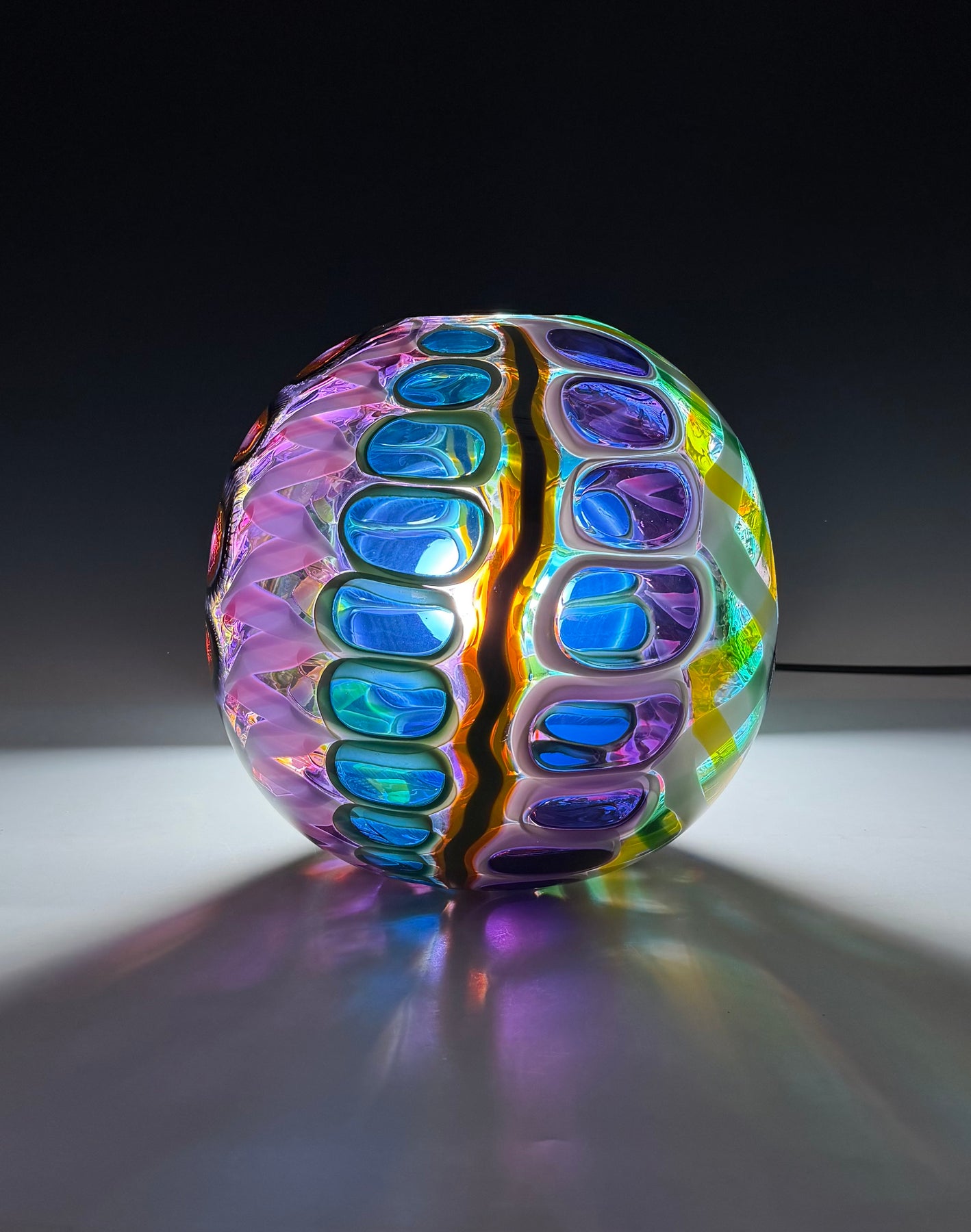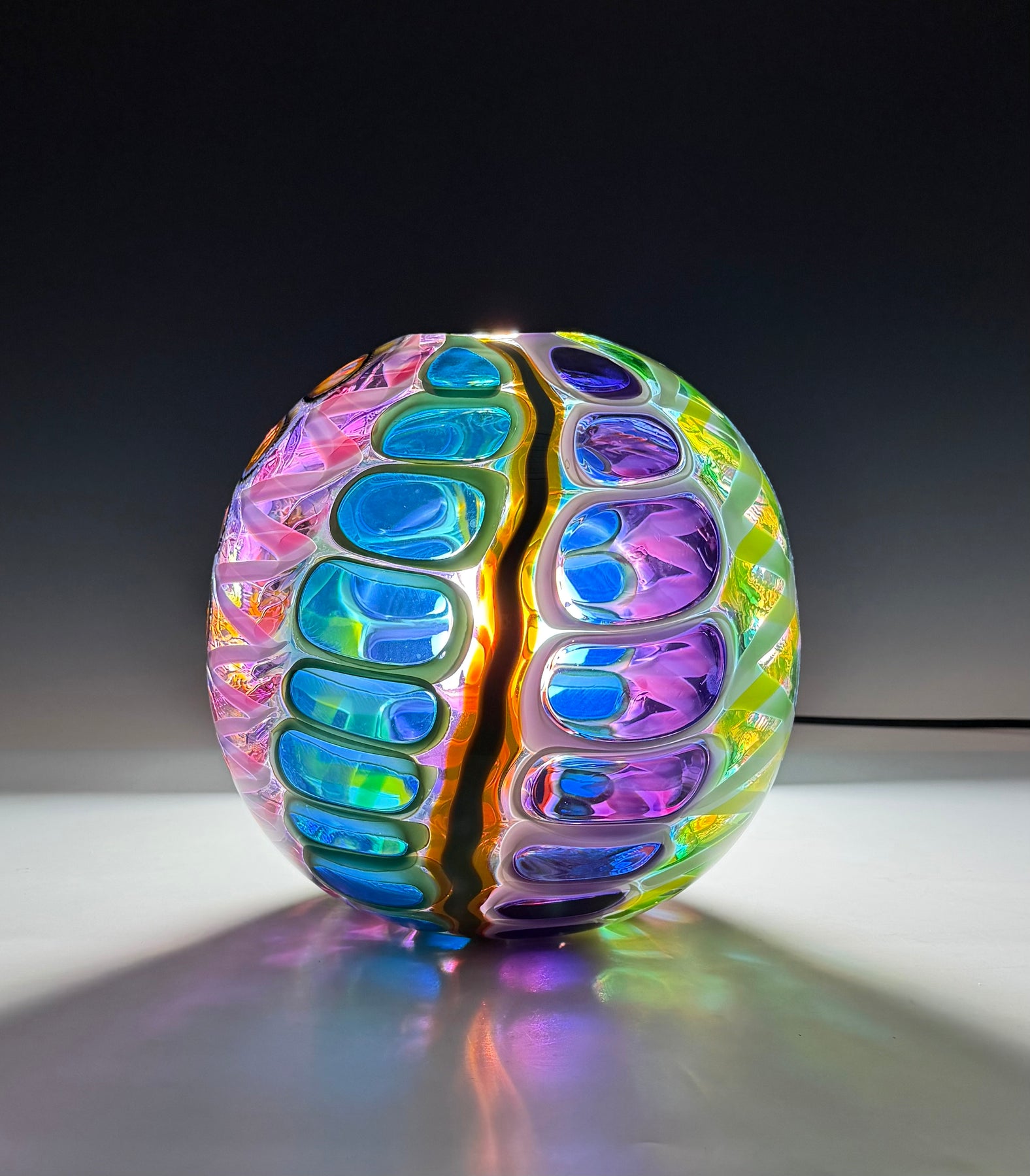 Este par de pulpos en duelo está luchando por abrir una burbuja de vidrio soplado de color azul agua con patas. John calentó la abertura superior del recipiente para que pareciera que las patas del pulpo lo estaban separando. El color de esta pareja de pulpos es magenta moteado.