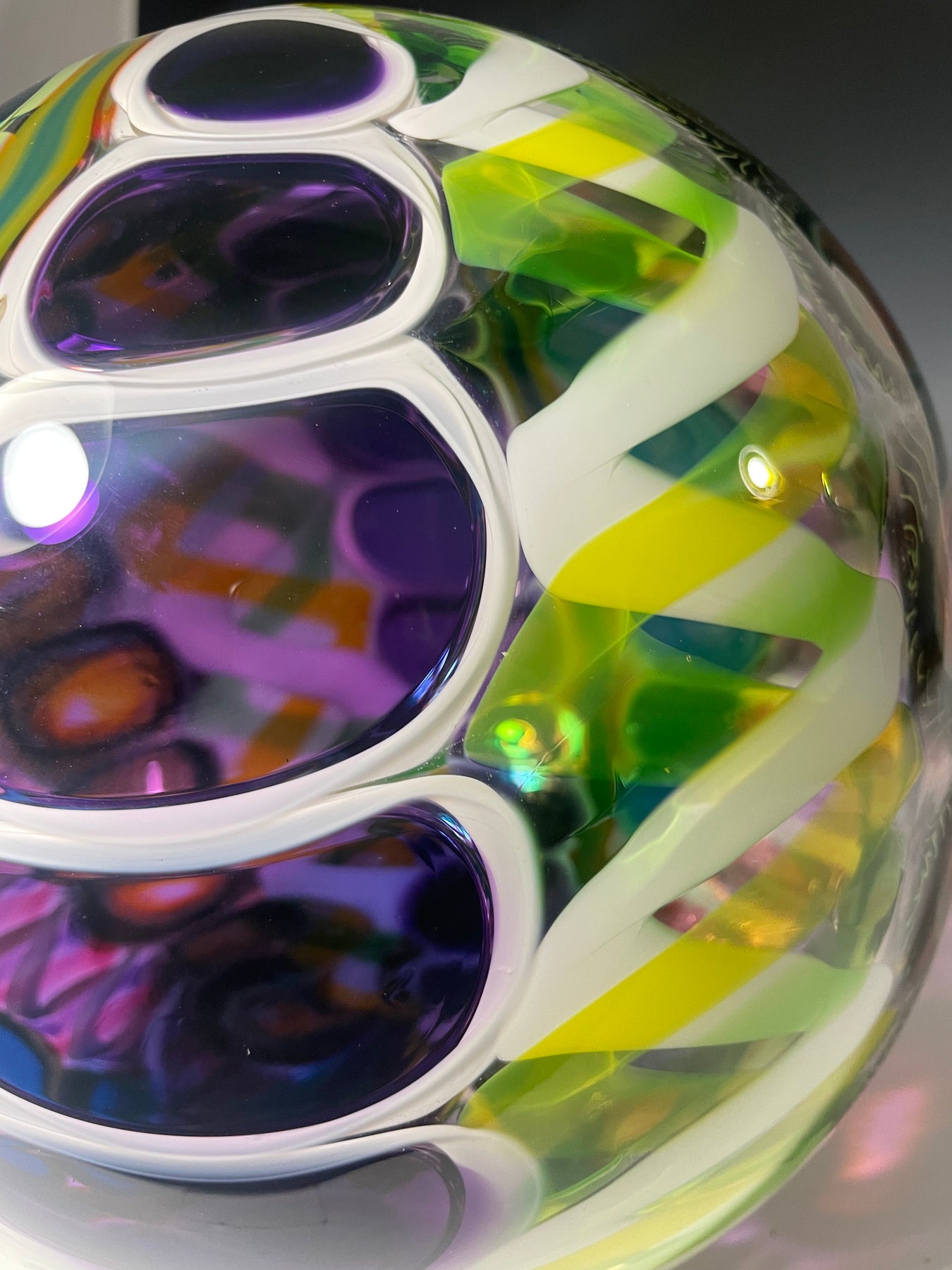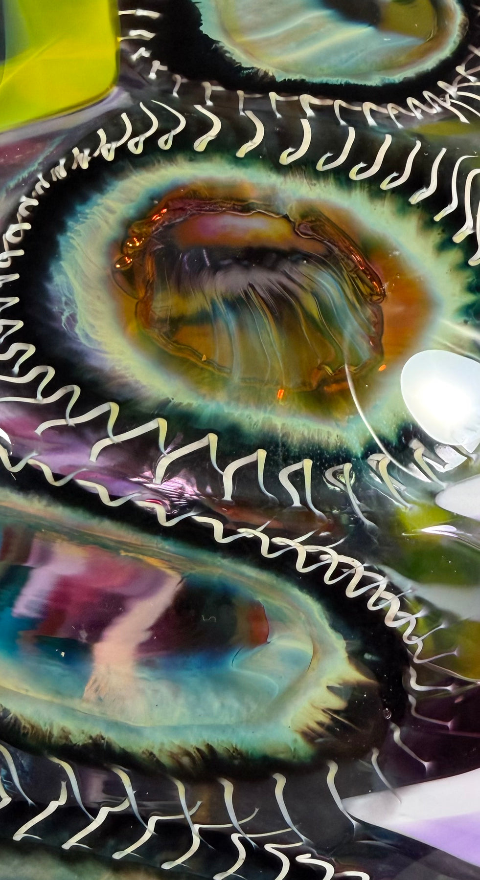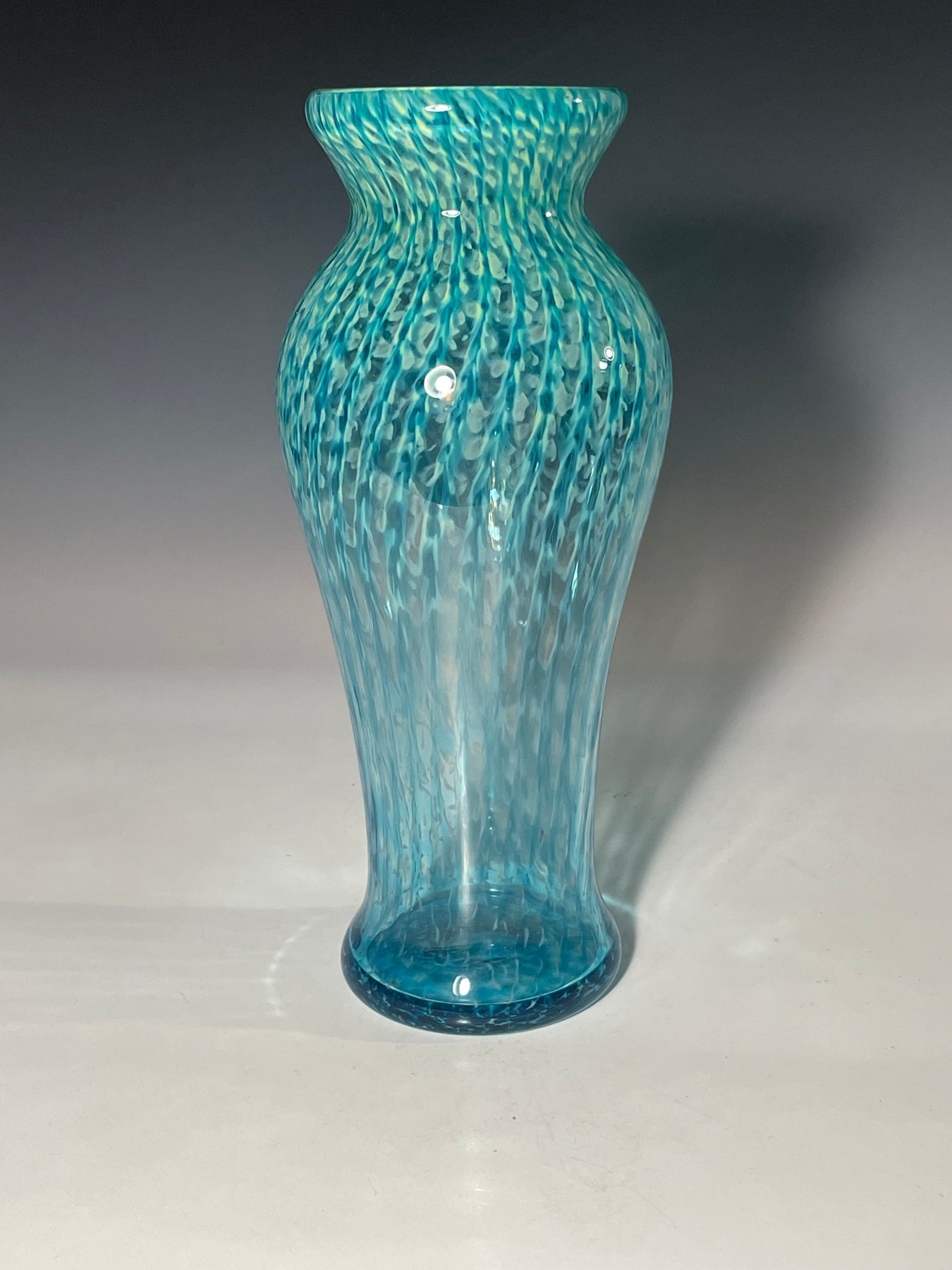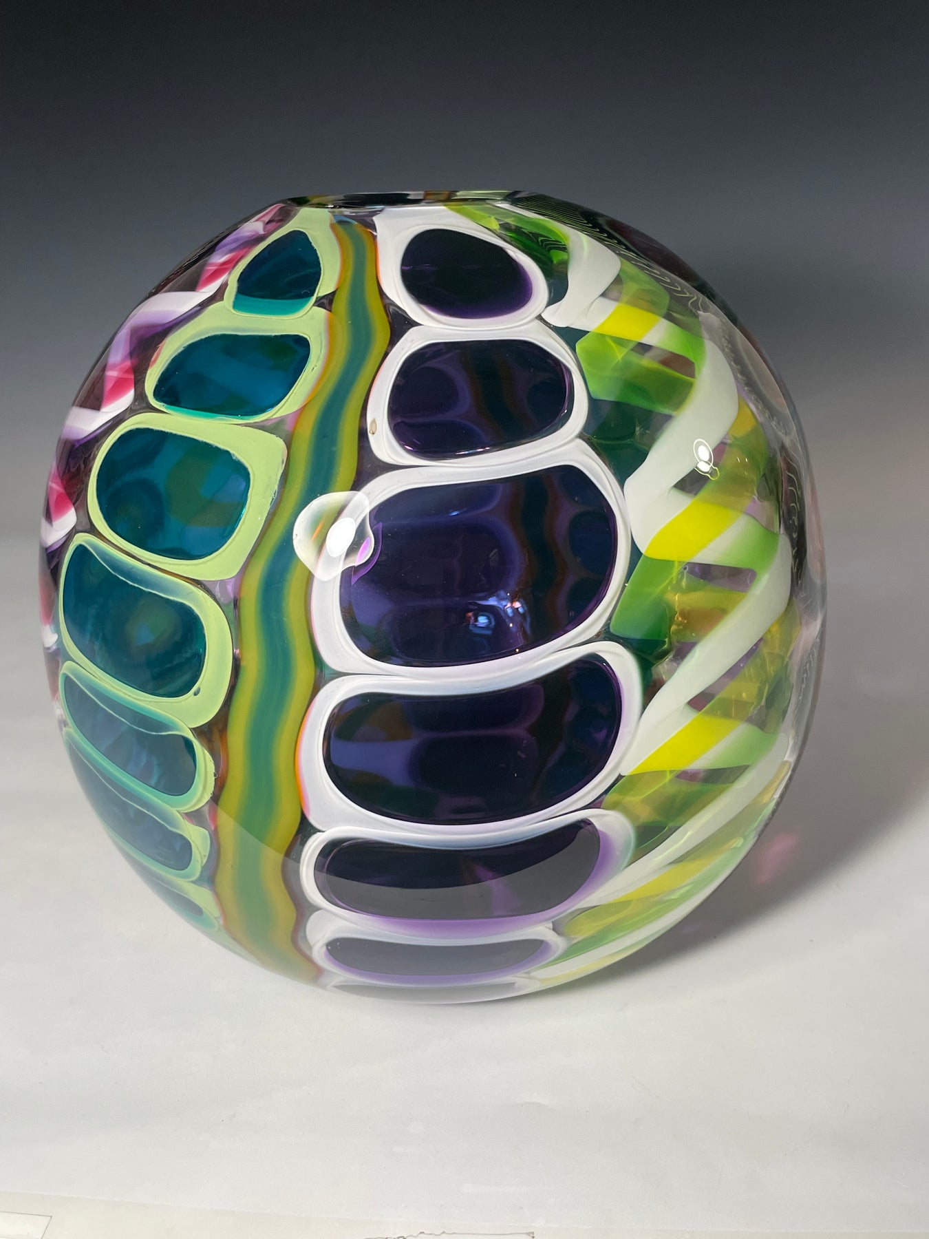 Este par de pulpos en duelo está luchando por abrir una burbuja de vidrio soplado de color azul agua con patas. John calentó la abertura superior del recipiente para que pareciera que las patas del pulpo lo estaban separando. El color de esta pareja de pulpos es magenta moteado.