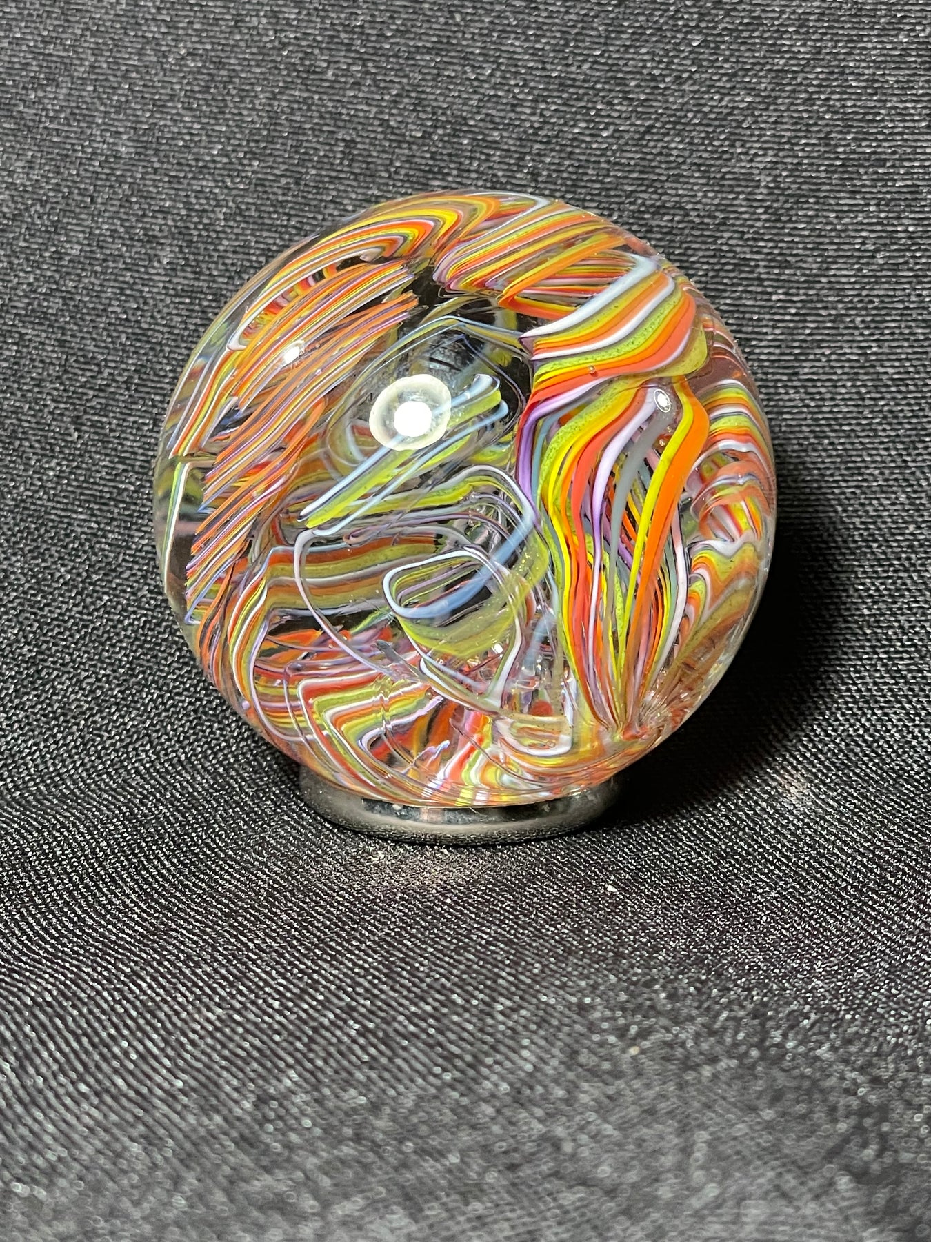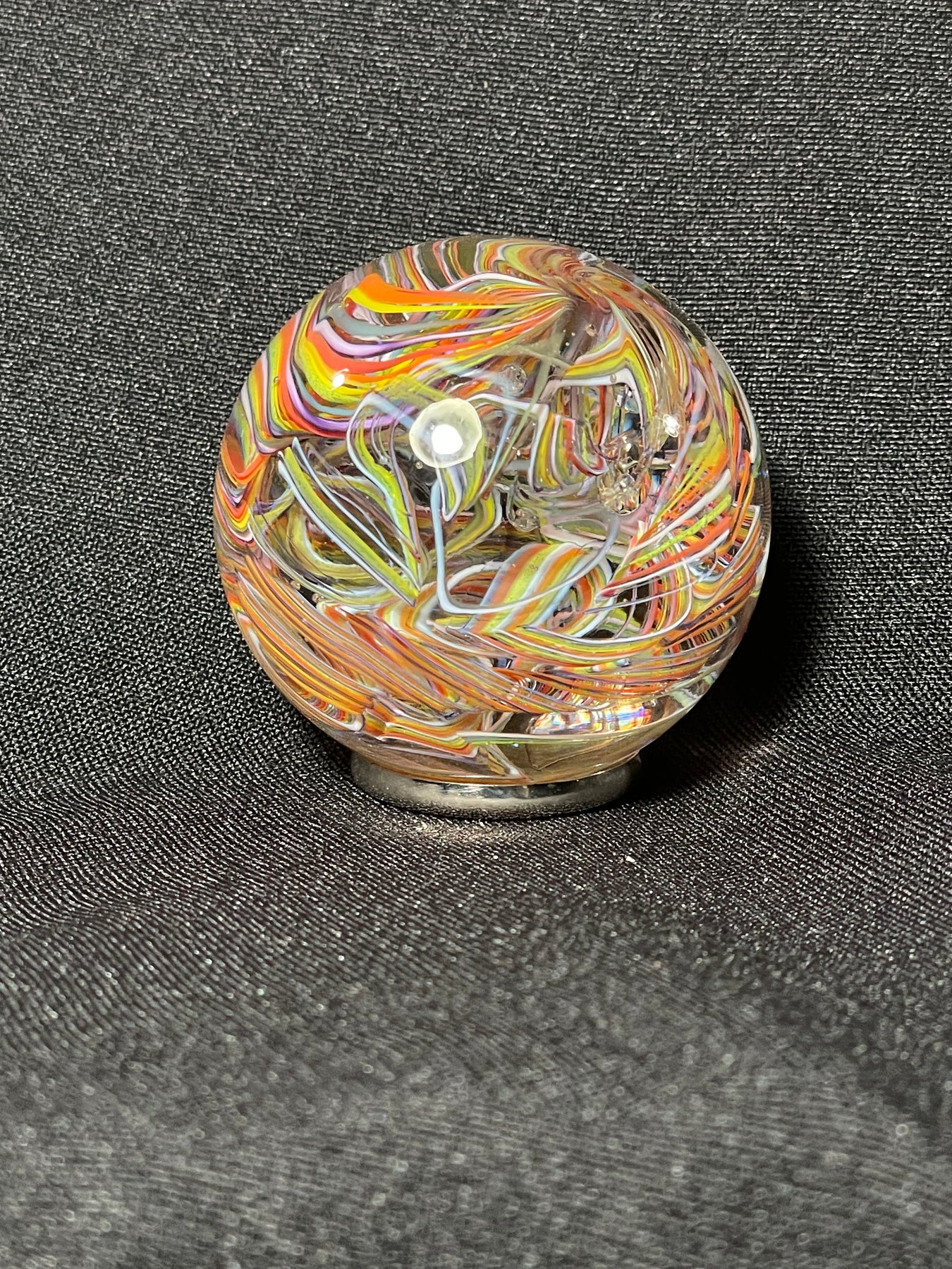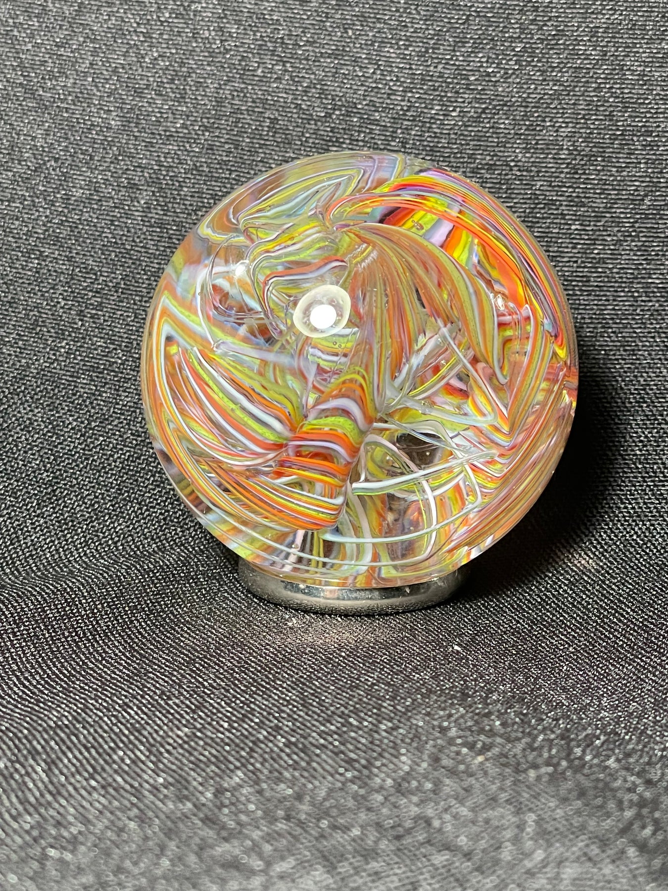 Este par de pulpos en duelo está luchando por abrir una burbuja de vidrio soplado de color azul agua con patas. John calentó la abertura superior del recipiente para que pareciera que las patas del pulpo lo estaban separando. El color de esta pareja de pulpos es magenta moteado.