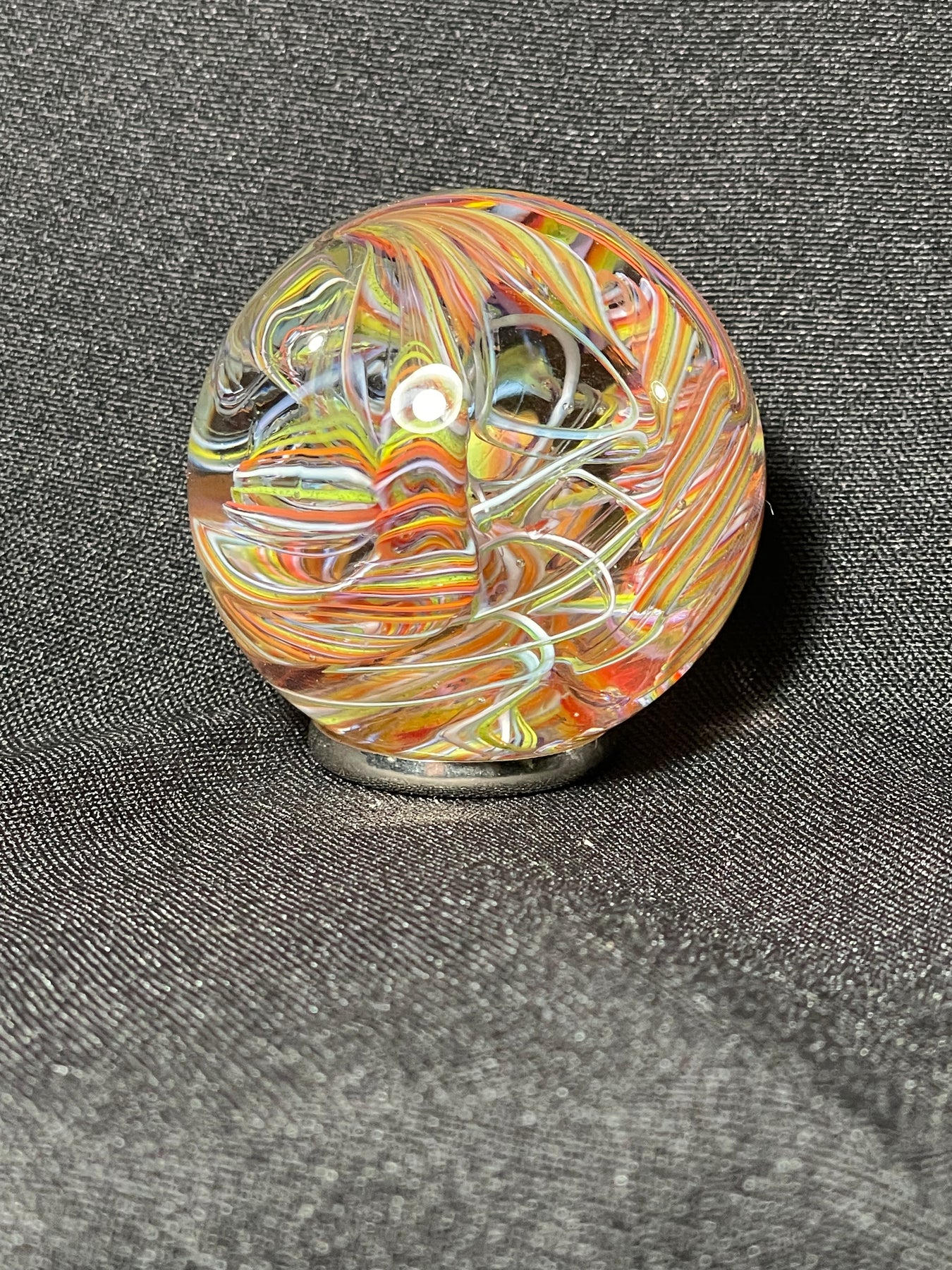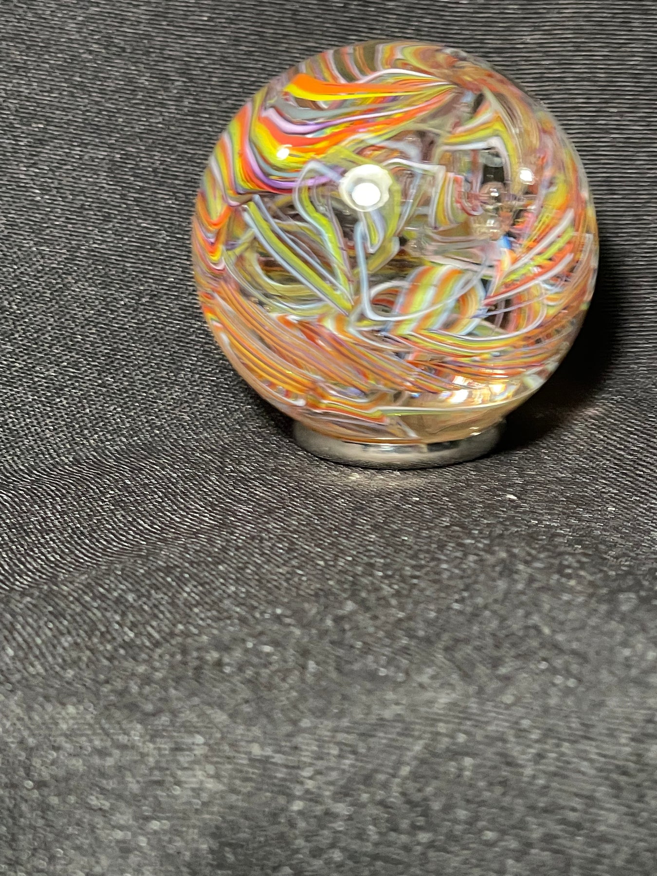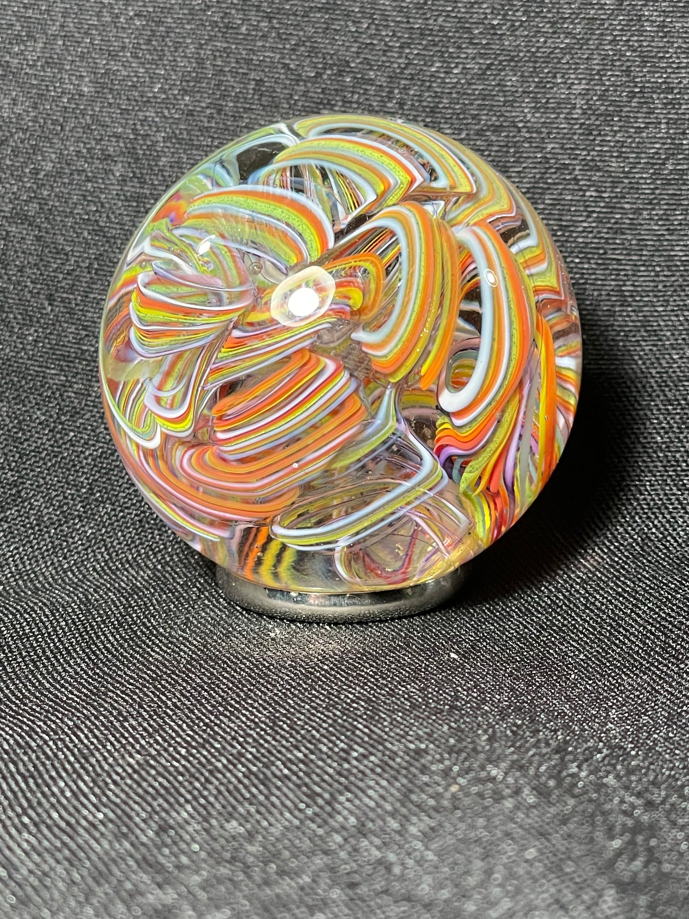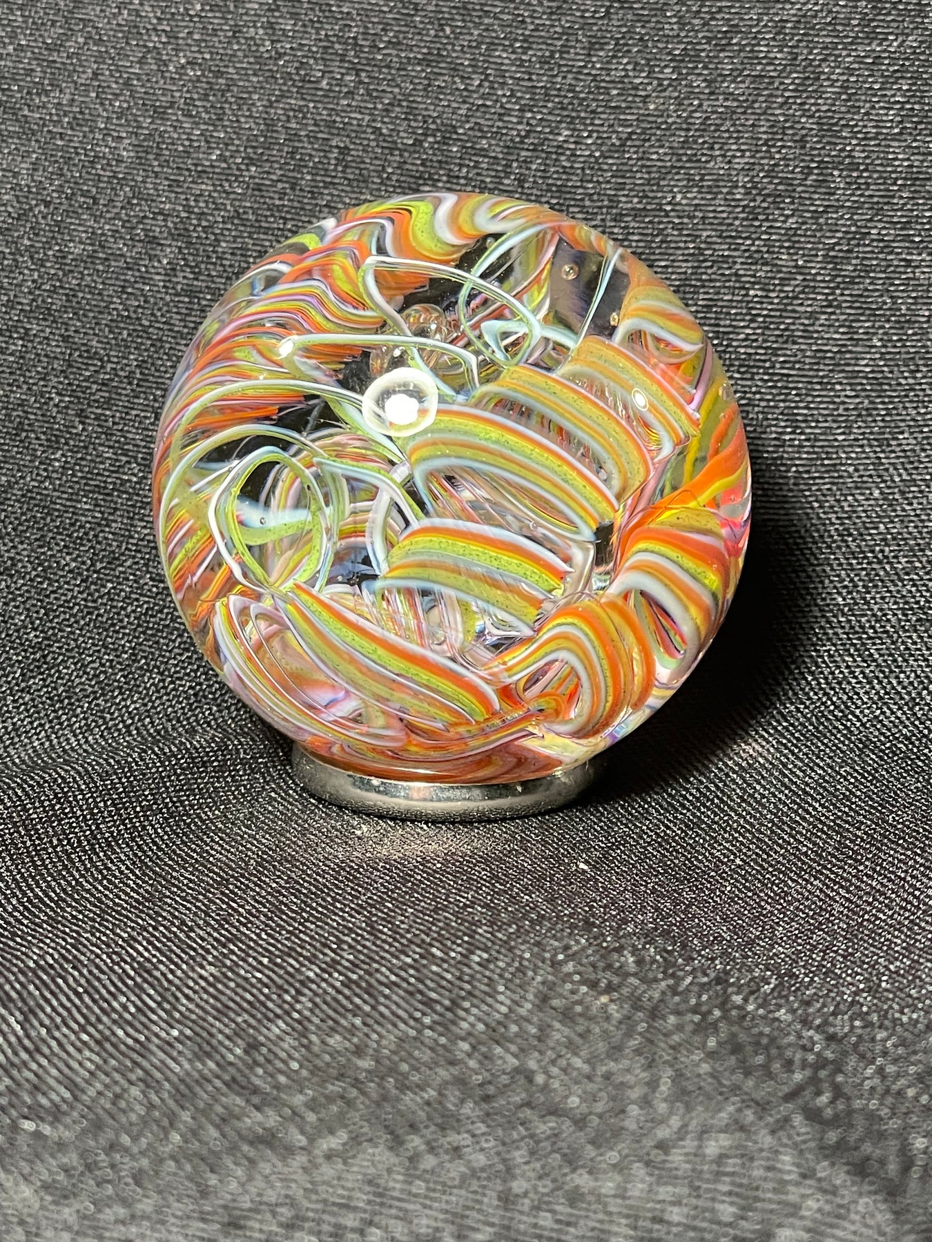 Este par de pulpos en duelo está luchando por abrir una burbuja de vidrio soplado de color azul agua con patas. John calentó la abertura superior del recipiente para que pareciera que las patas del pulpo lo estaban separando. El color de esta pareja de pulpos es magenta moteado.