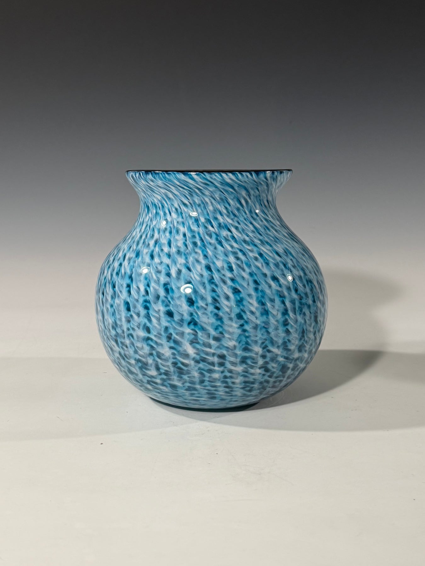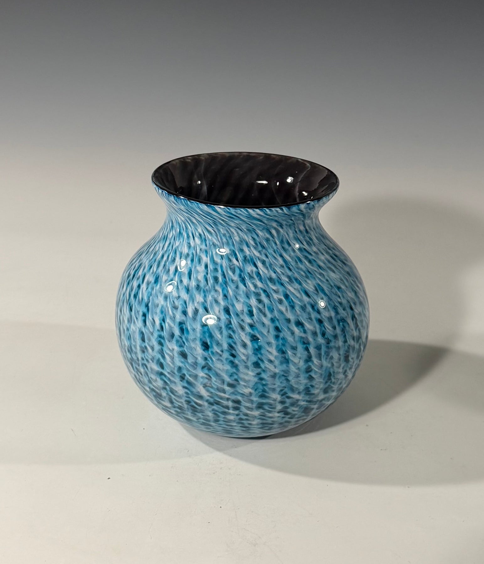 This is a hand blown glass vase made with theee layers of color; black, white, and aqua , measuring about 6 inches tall and 7 inches wide. the colors of glass are layered and put into a mood to create the blue stripes. Then the glass is blown and shaped to create the form using gravity and wet newspaper.