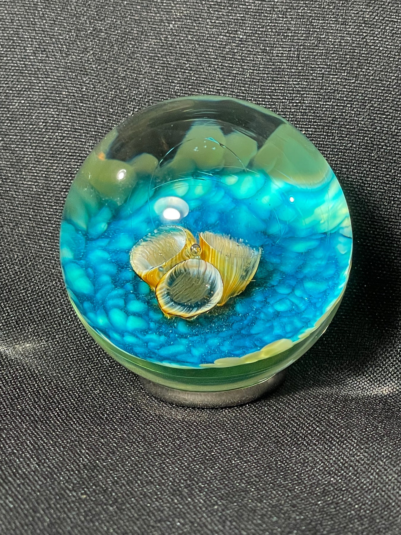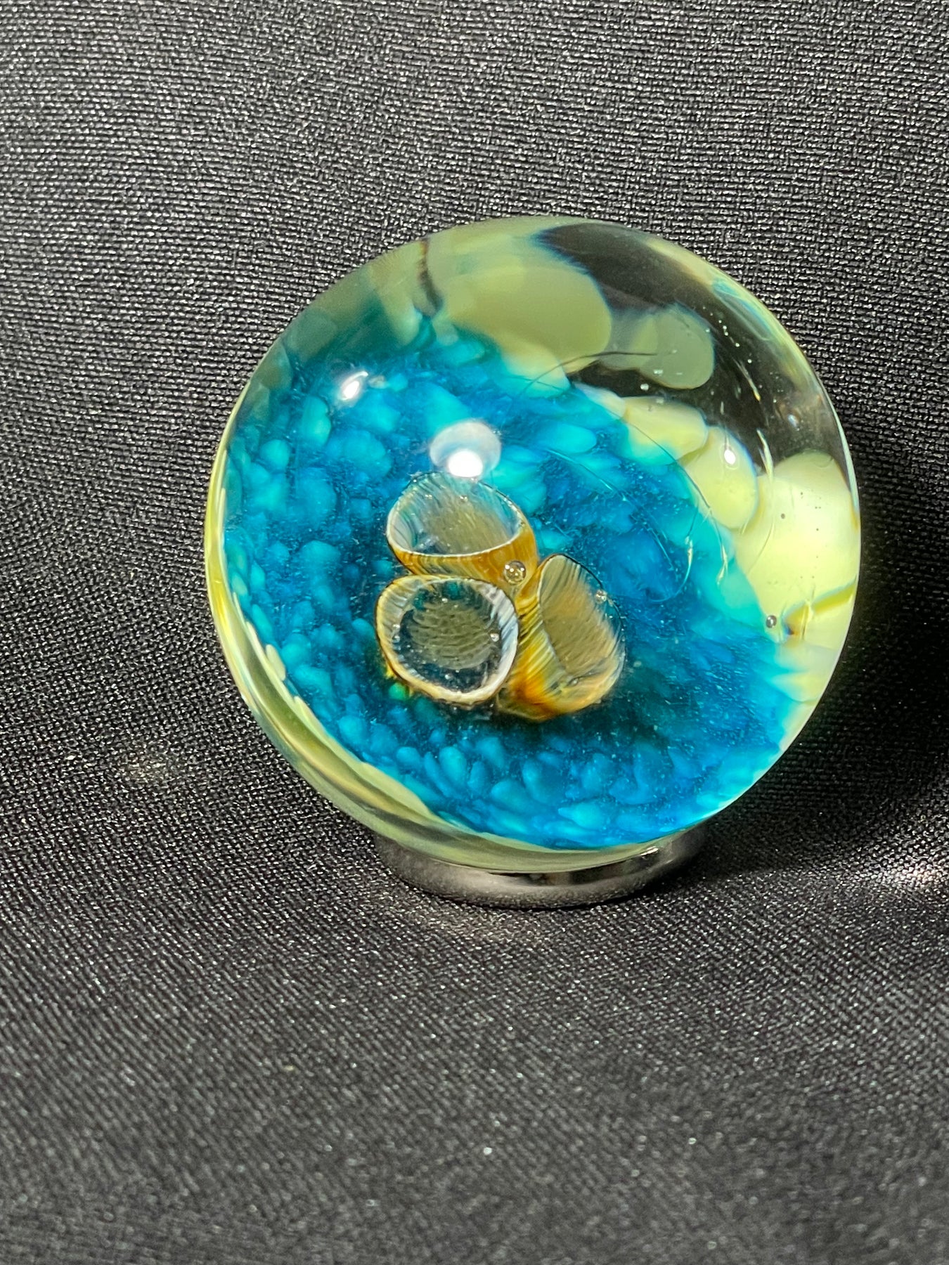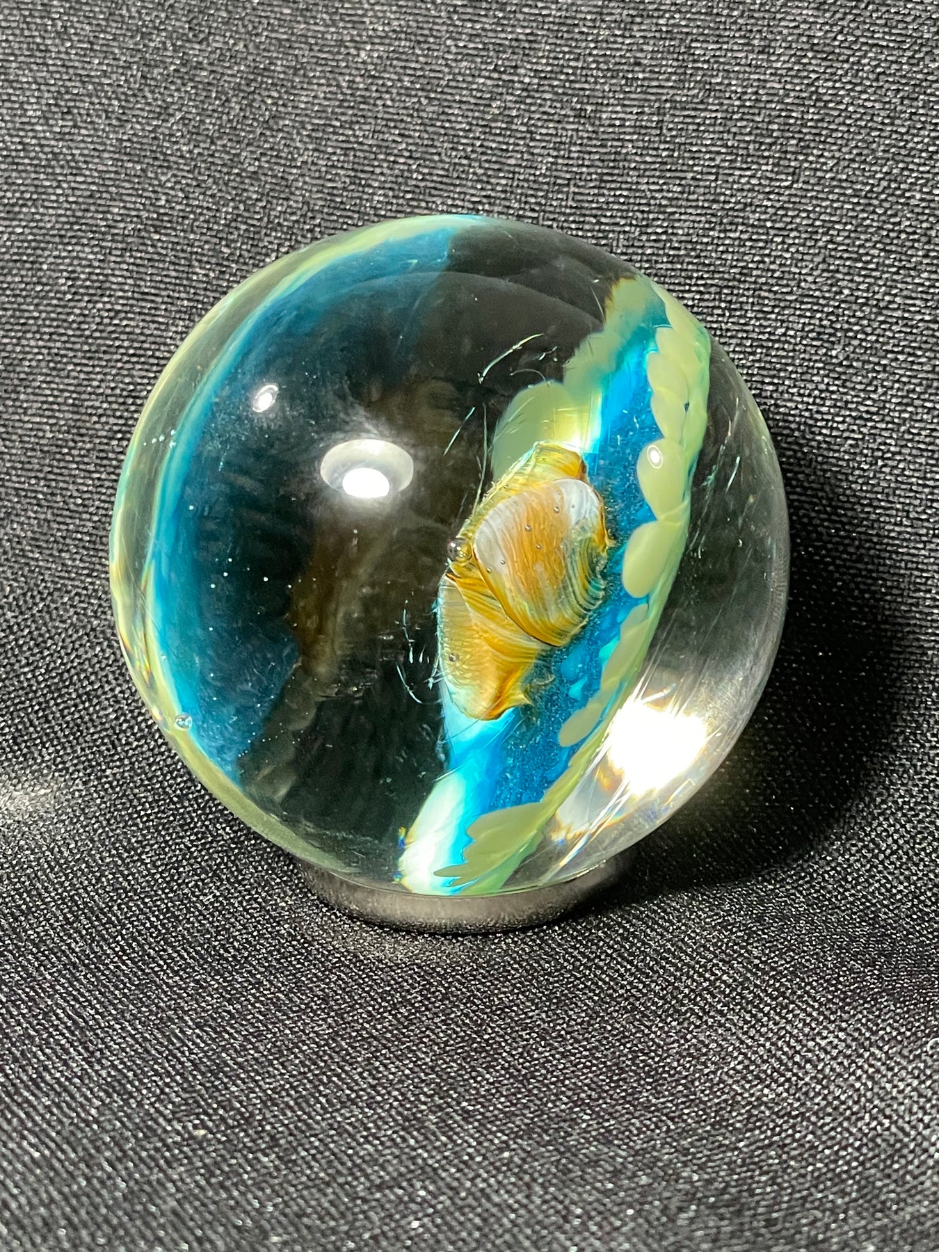 This large marble measures about 2.5 inches and is inspired by tube sponges in the coral reef. The colors that form the tubes in the marble are created by layering rods of glass and then stretching the rods into another rod that is then cut into short sections called murrine. After the murrine are formed, I put the coral reef together and finish off the marble in a graphite mold to give it a perfect sphere shape.