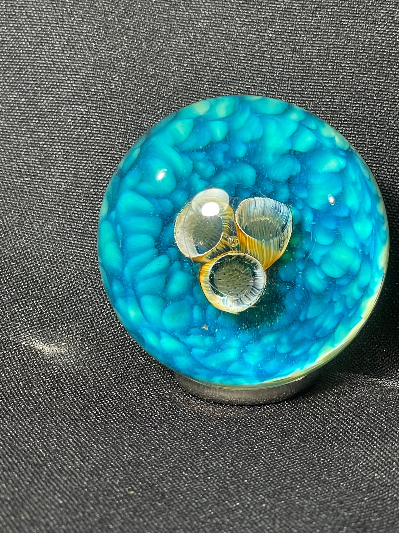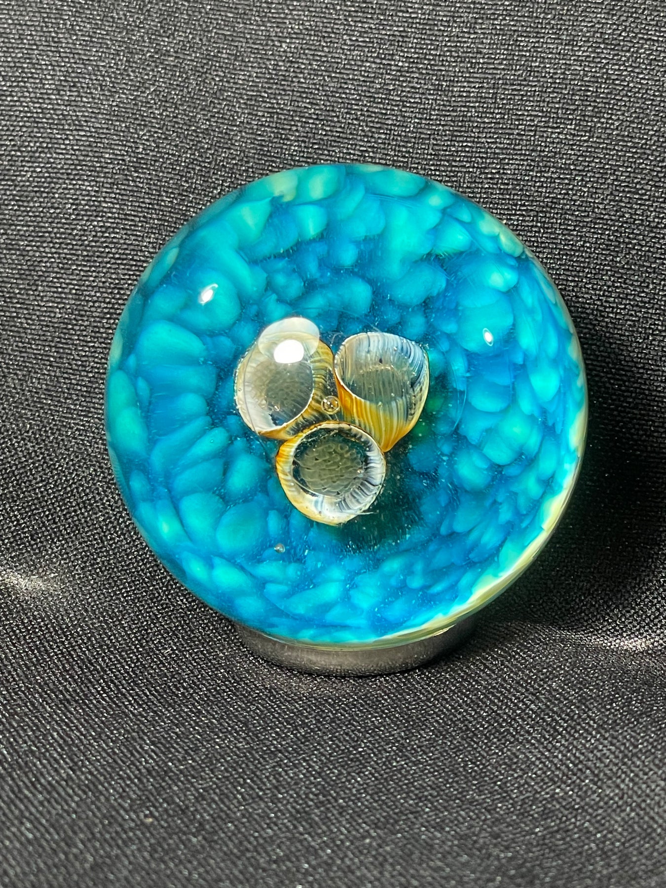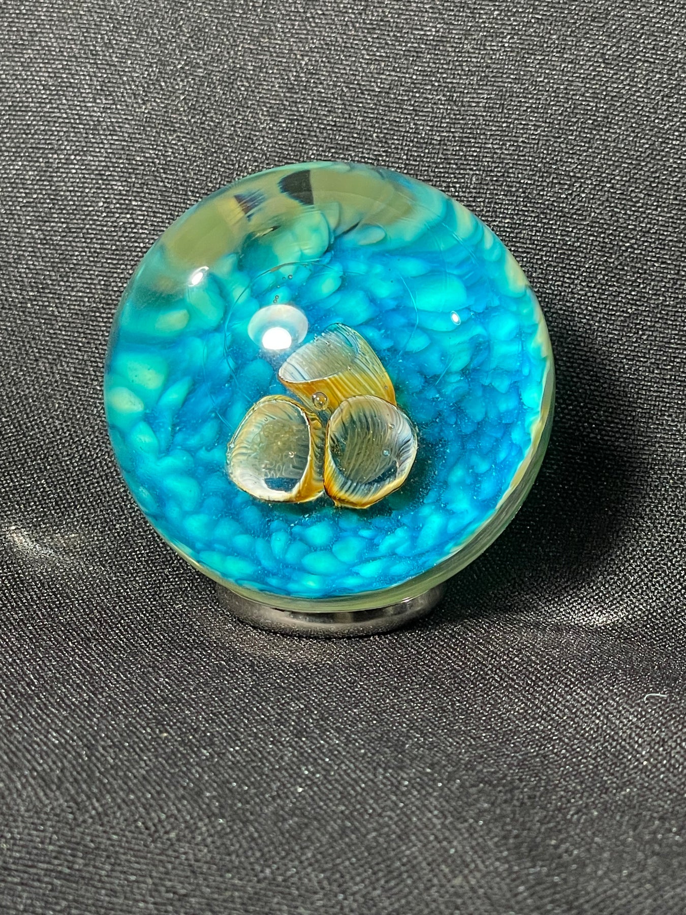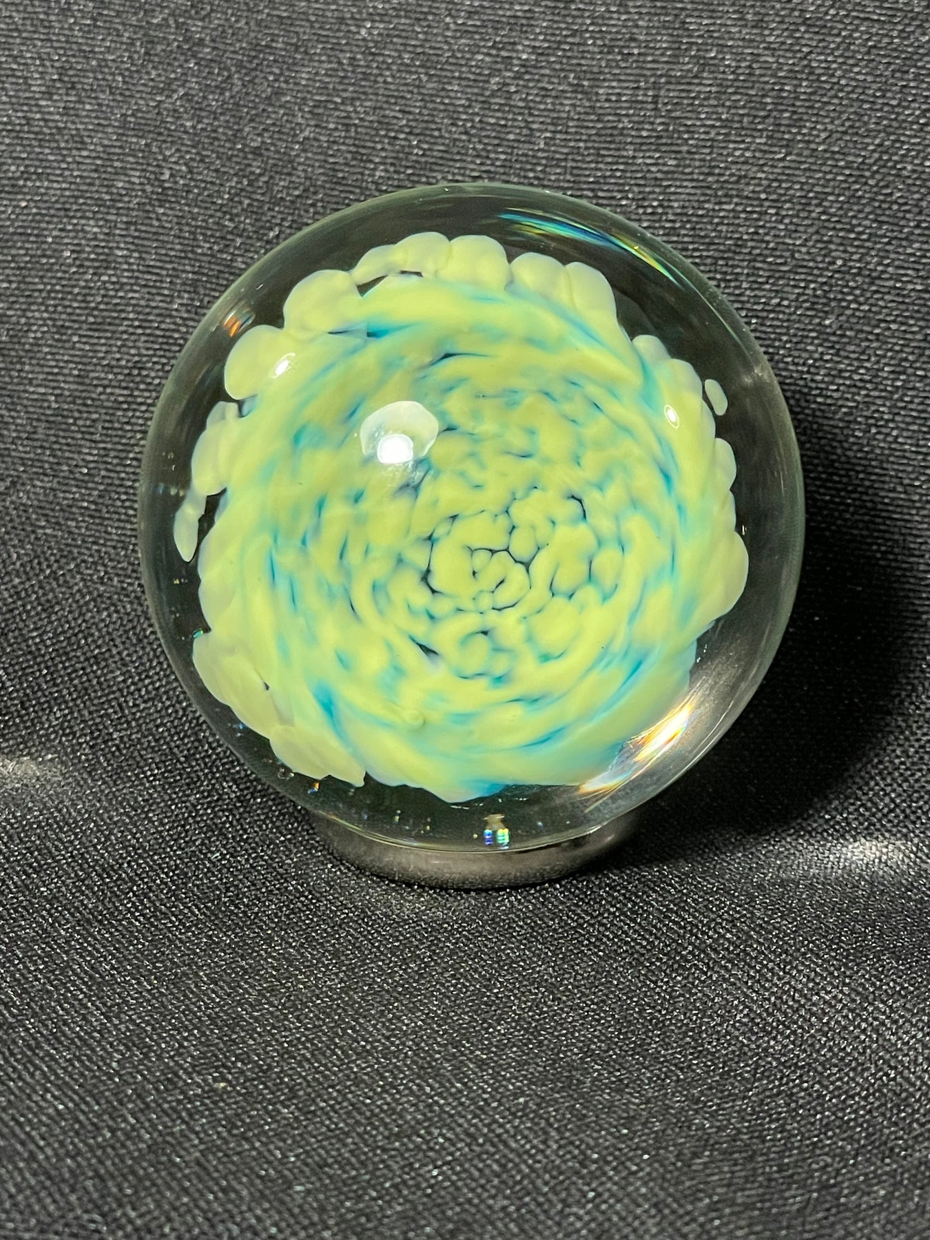 This large marble measures about 2.5 inches and is inspired by tube sponges in the coral reef. The colors that form the tubes in the marble are created by layering rods of glass and then stretching the rods into another rod that is then cut into short sections called murrine. After the murrine are formed, I put the coral reef together and finish off the marble in a graphite mold to give it a perfect sphere shape.
